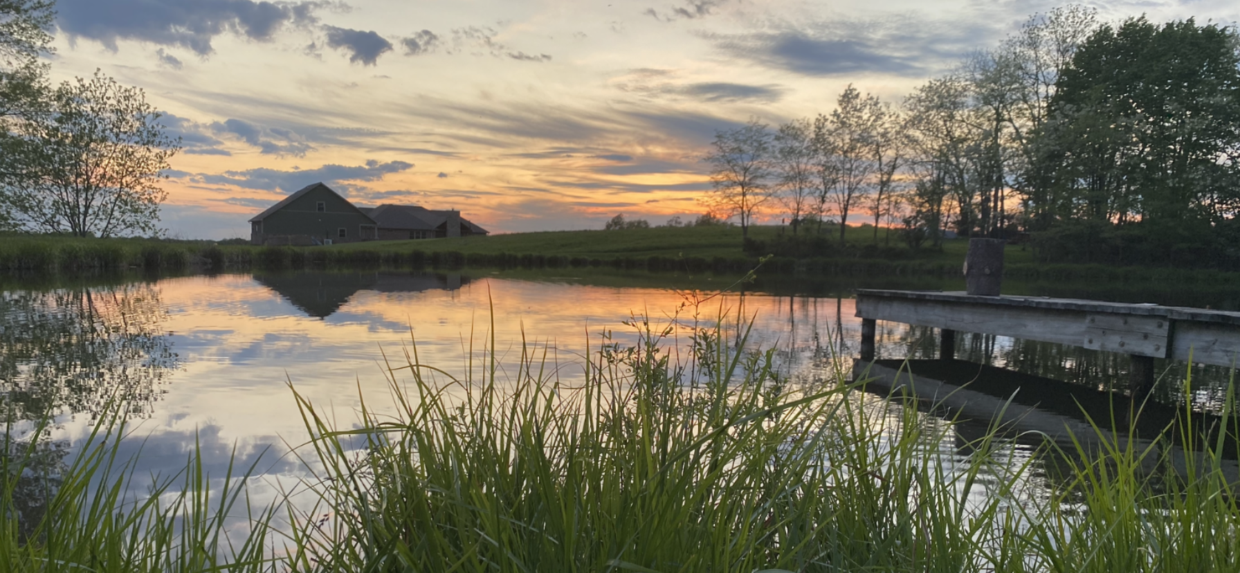 Sunset over a calm lake with a barn and dock.