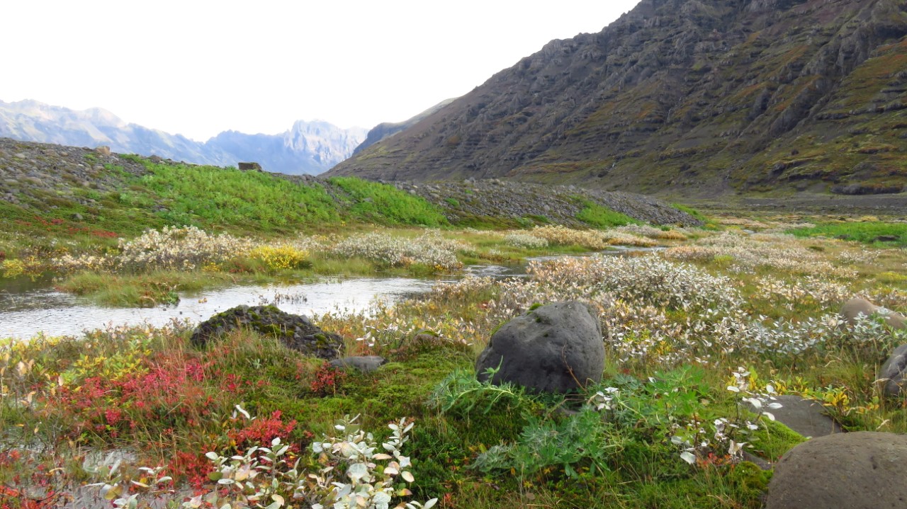 Mountain valley landscape painting with river, rocks, and wildflowers.