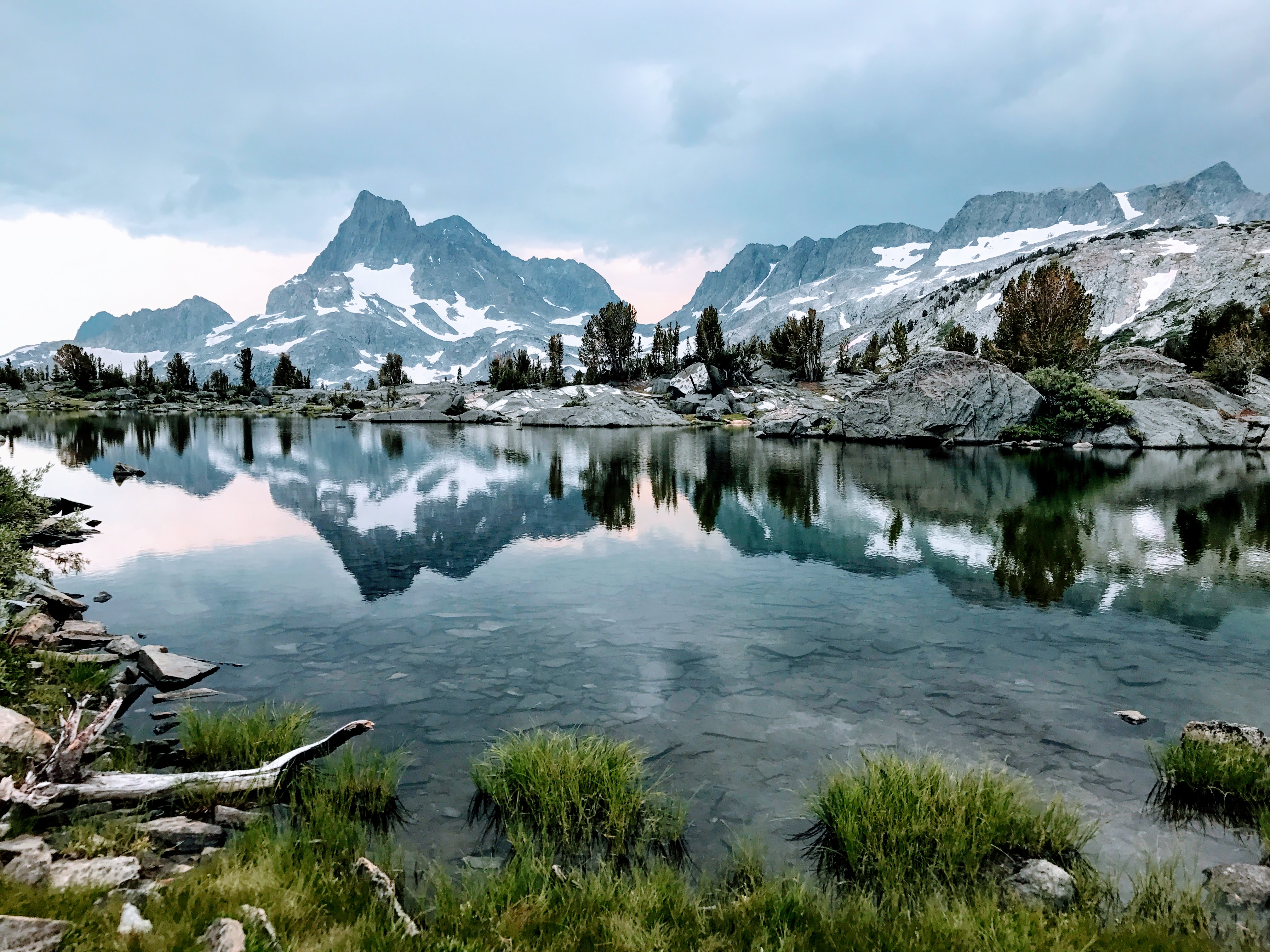 Mountain lake reflecting snow-capped peaks and sky.