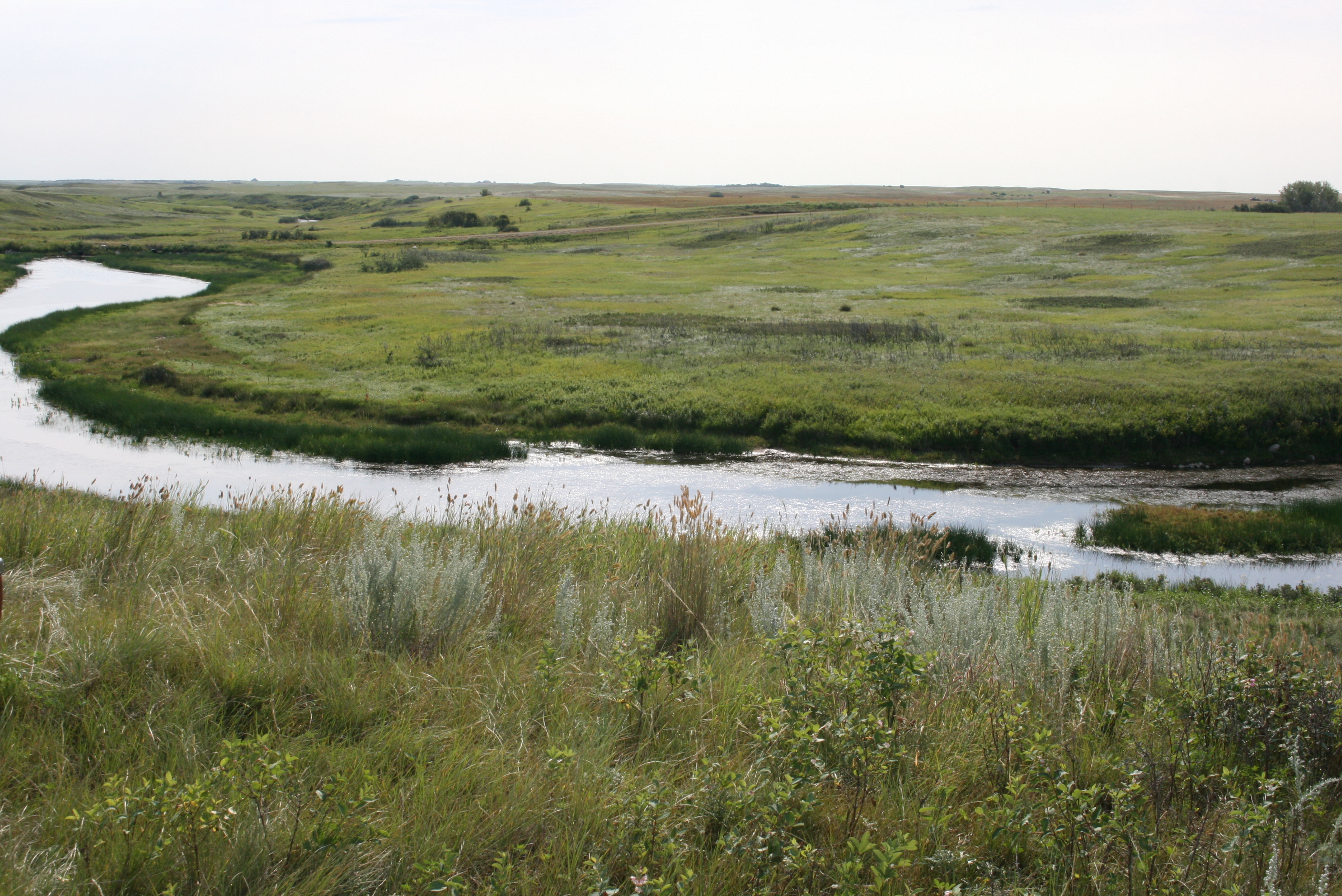 Sunset over a grassy field and distant hills.