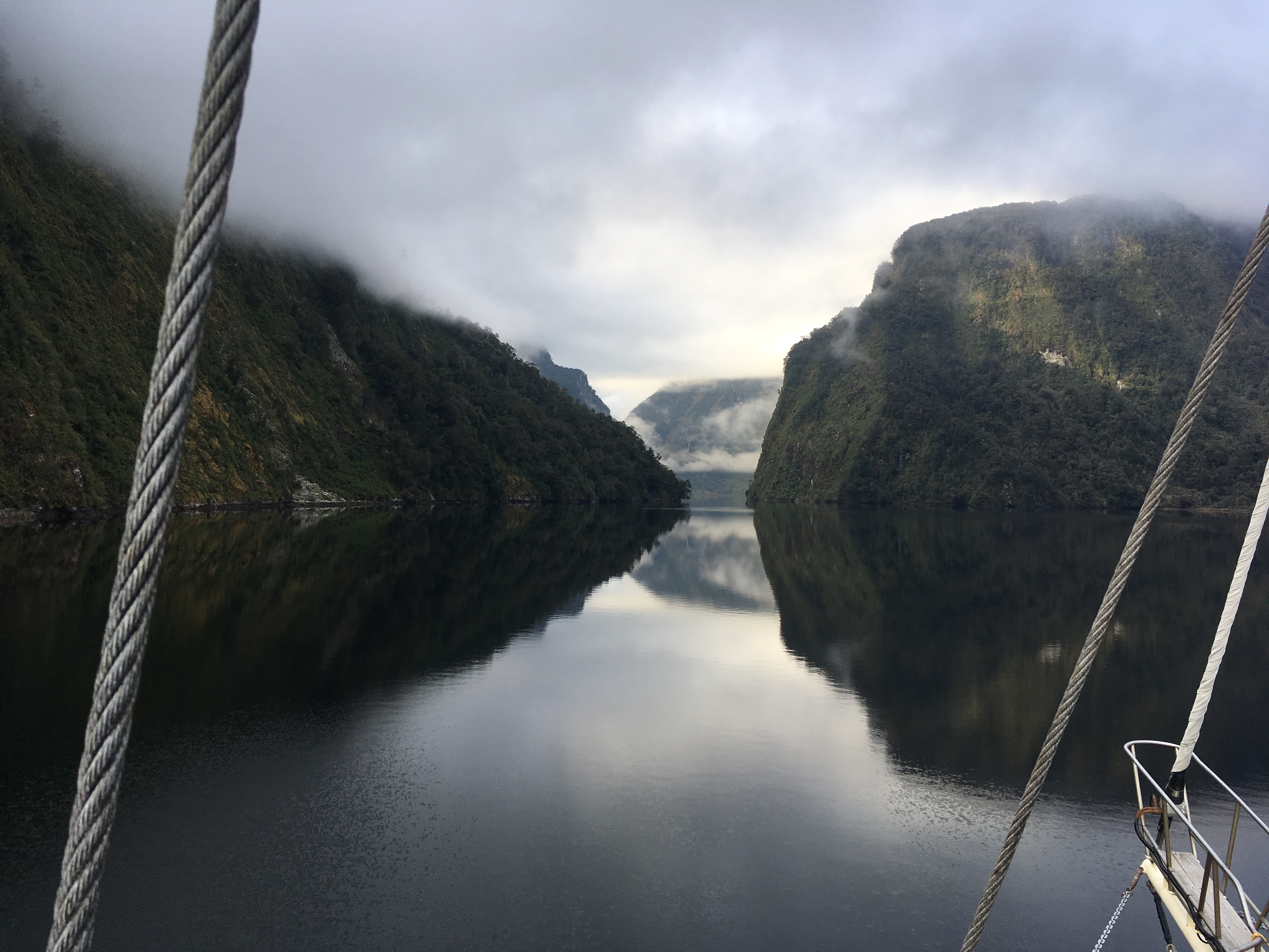 Painting of Doubtful Sound, New Zealand, viewed from a boat.
