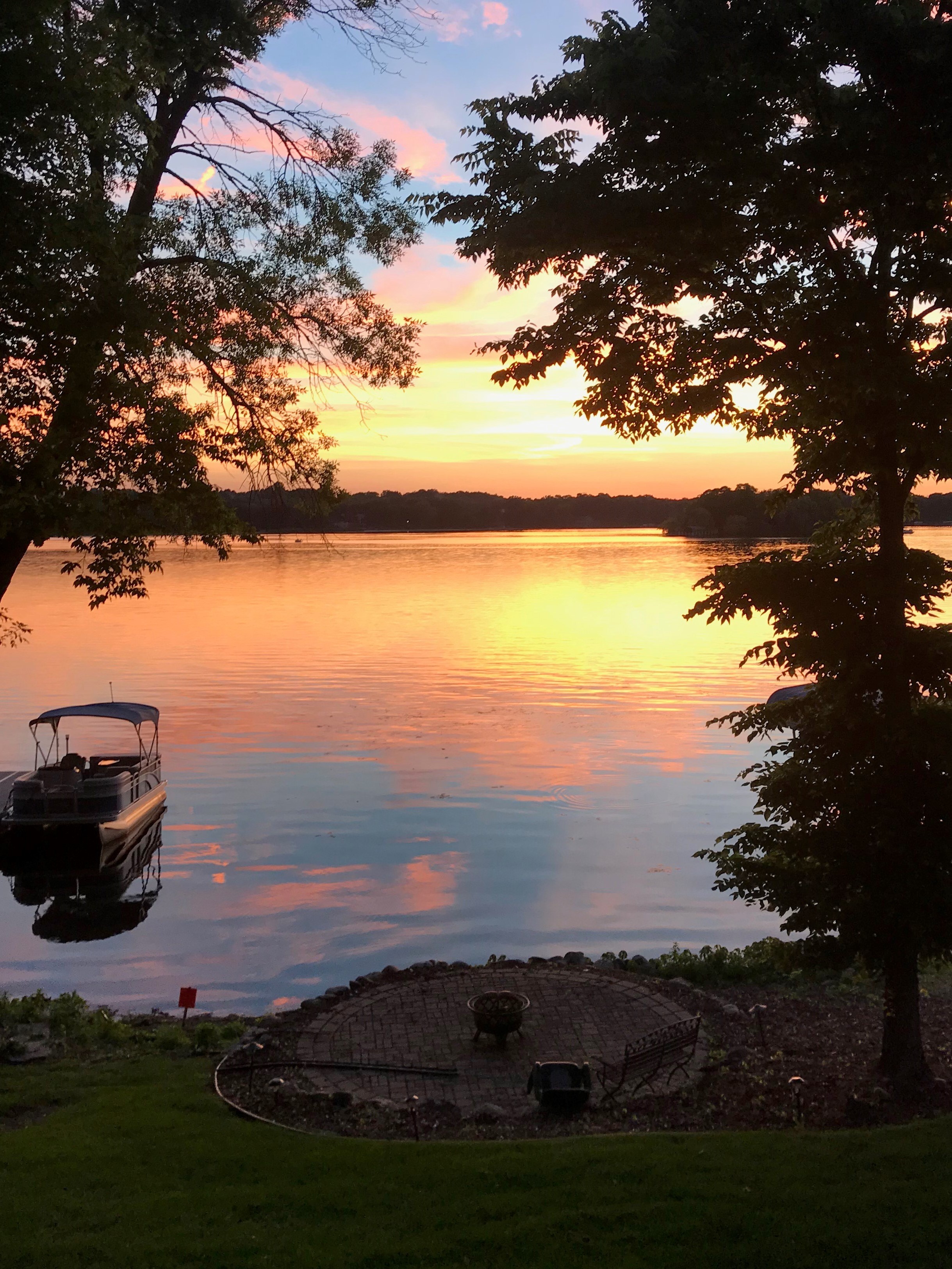 Sunset over lake with boat and fire pit.