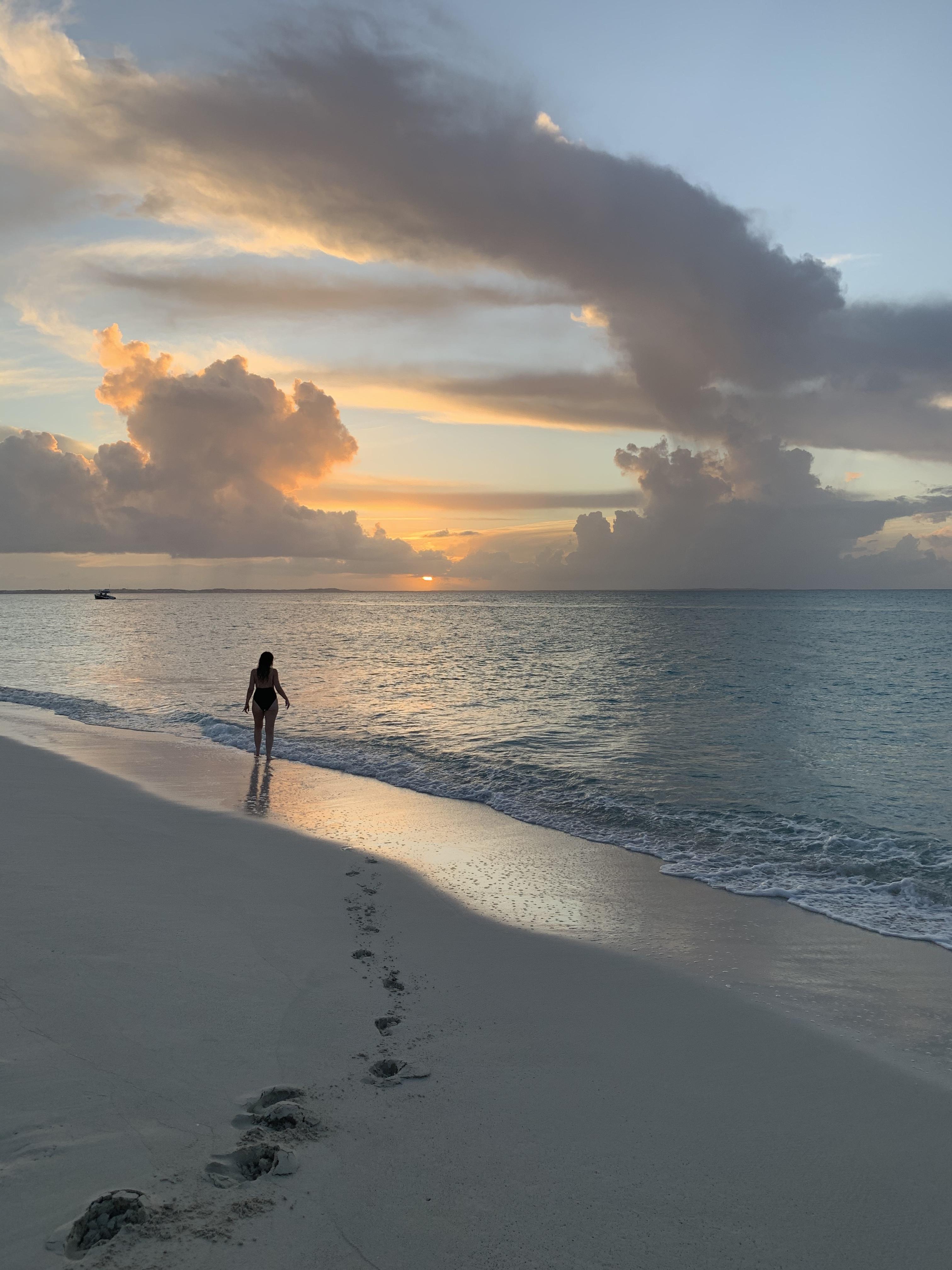 Sunset beach scene with a lone woman walking away from the viewer, leaving footprints in the sand.