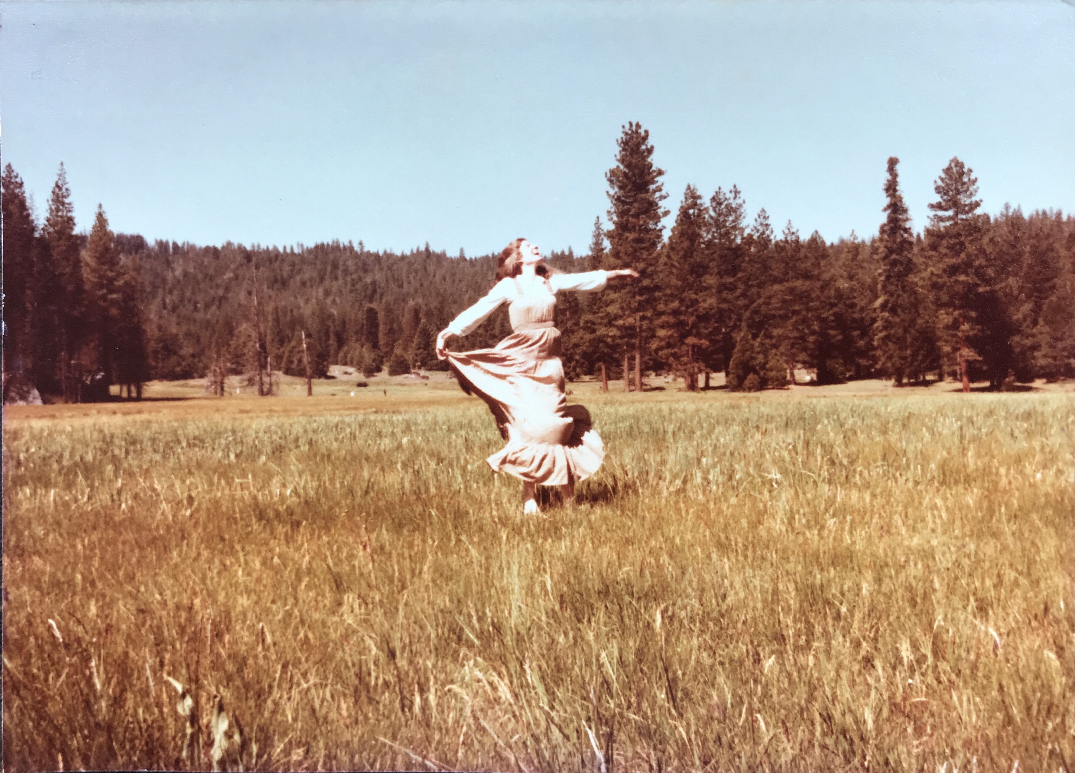 Woman in pink dress twirling in a field with trees in the background.