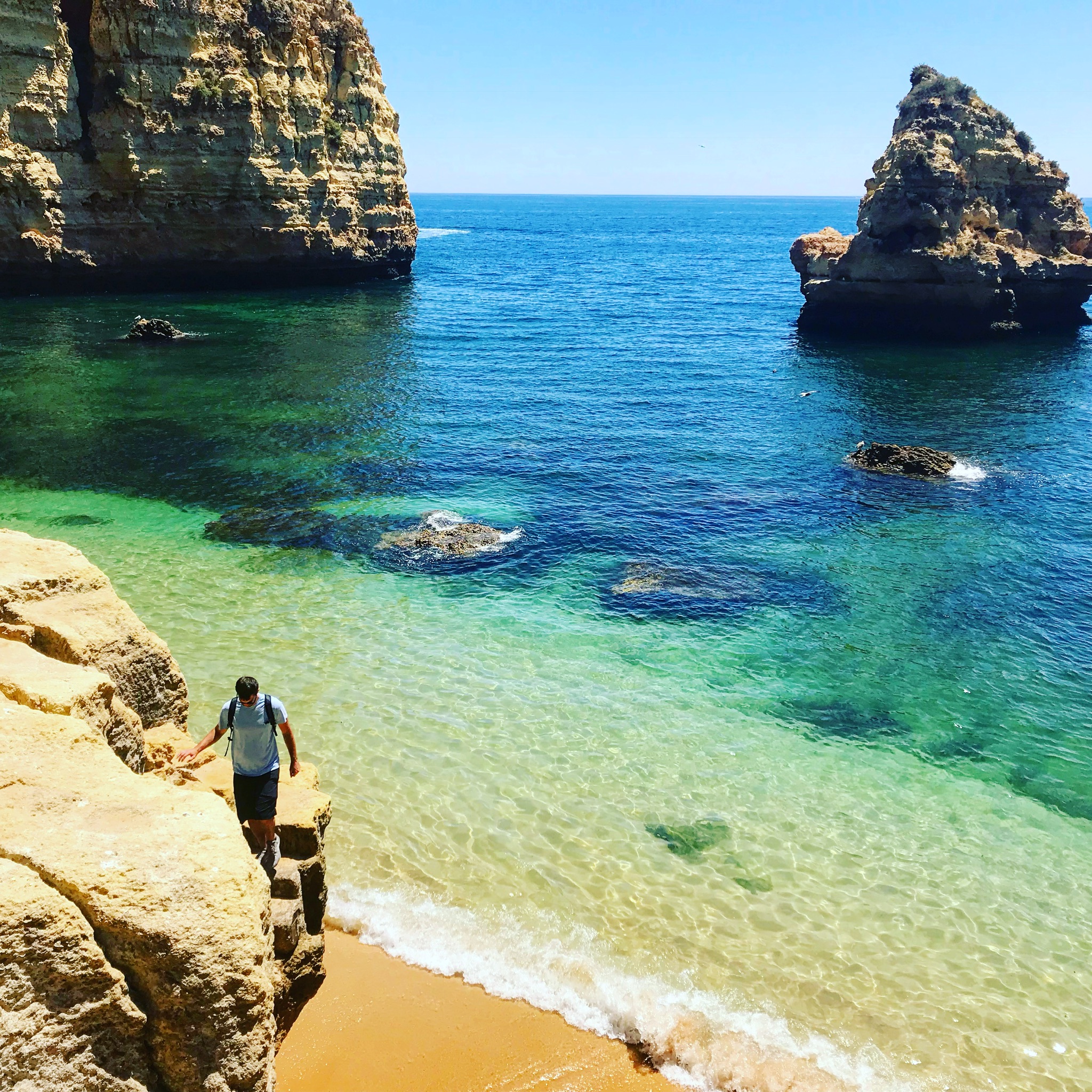 Painting of a man descending rocks to a green and blue ocean cove between two cliffs.