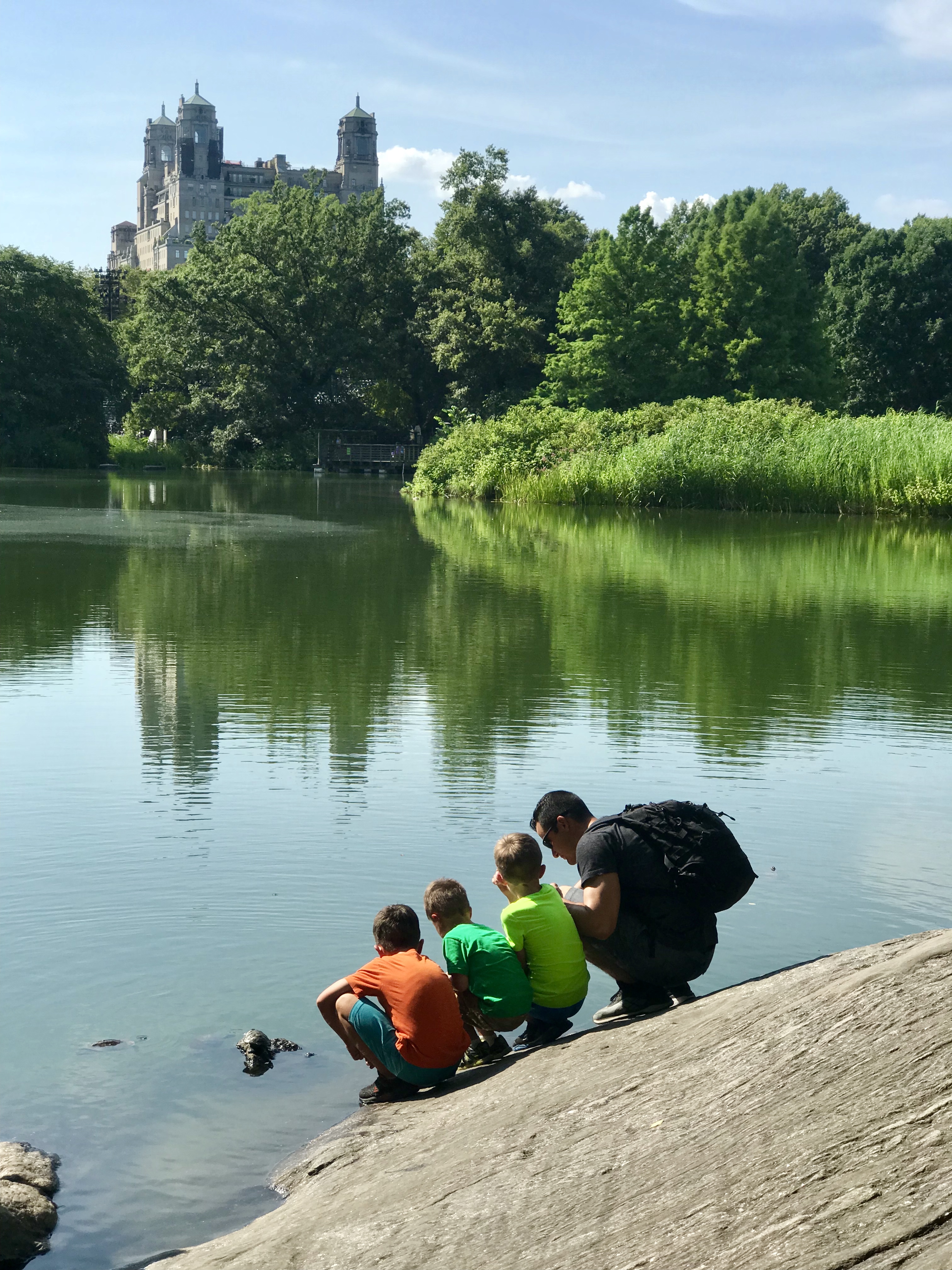 Man and three boys watching turtles in a pond with a building in the background.