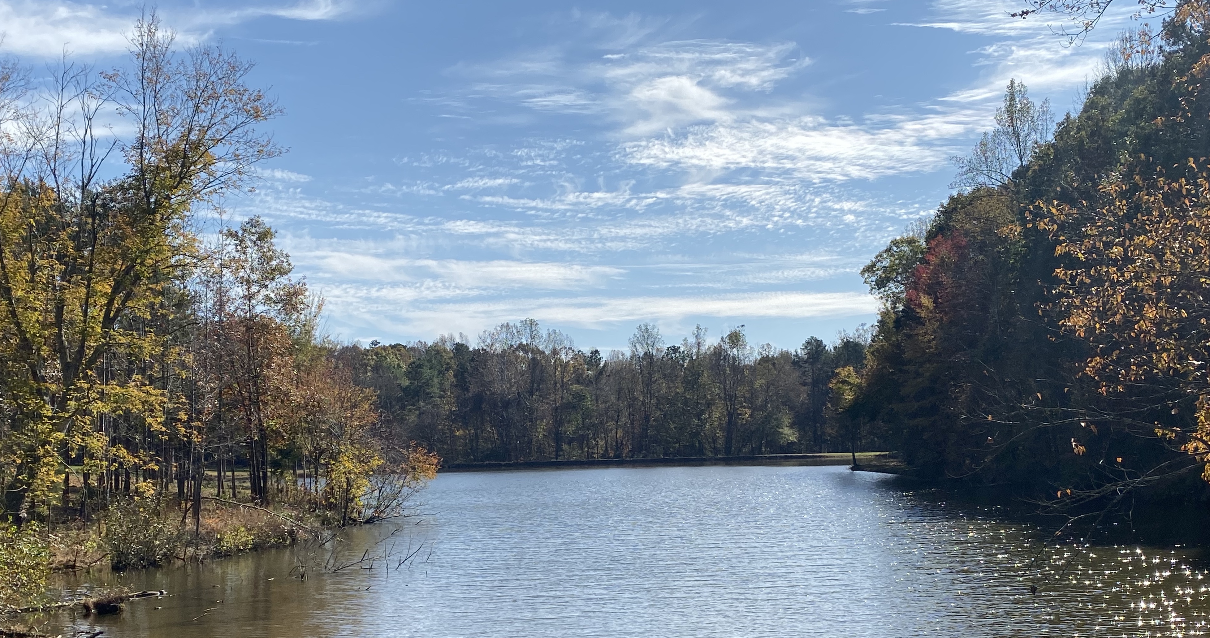 Autumnal landscape painting of a calm river flowing through a forest.
