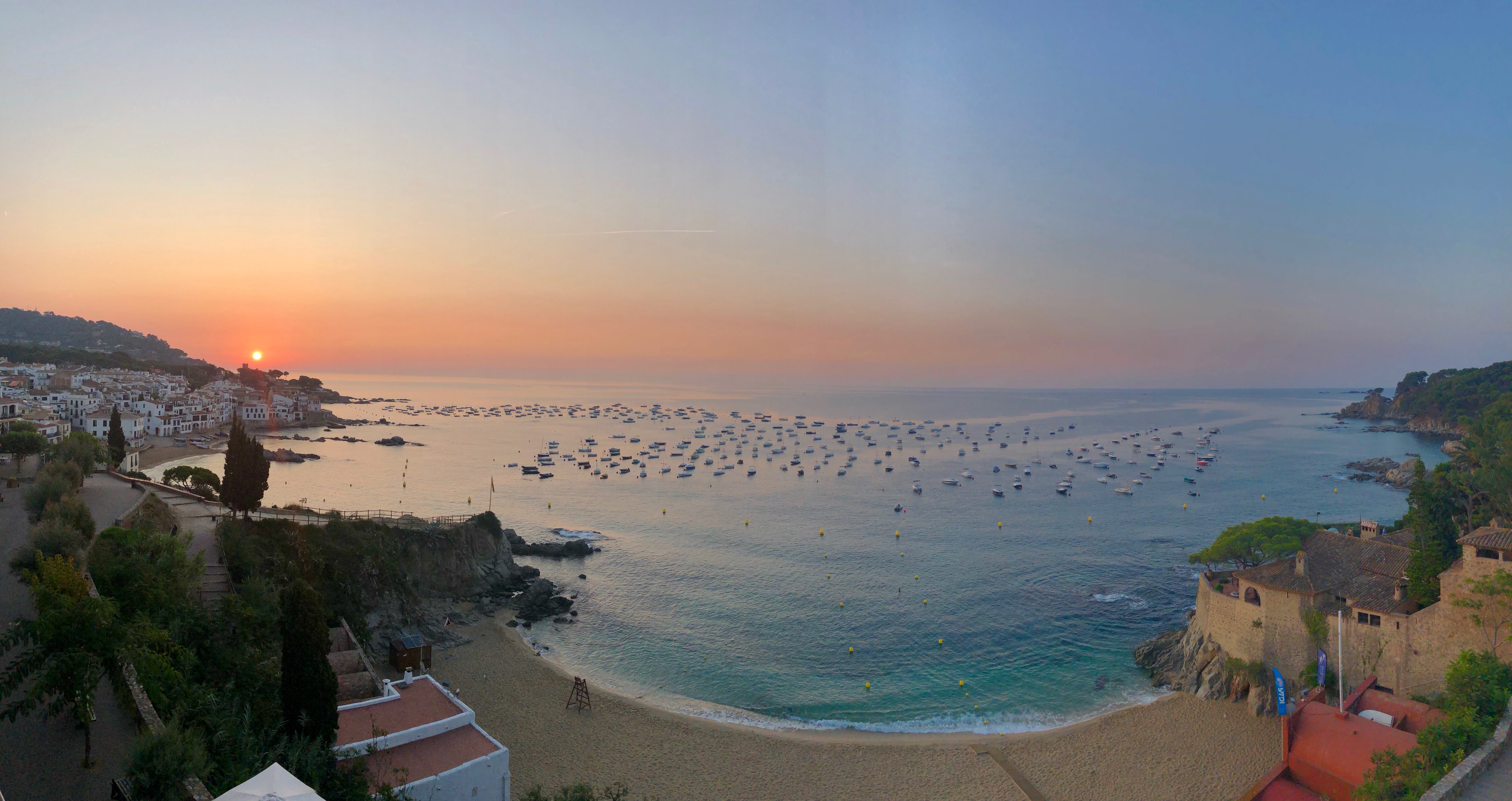 Coastal town at sunset, numerous boats in bay.