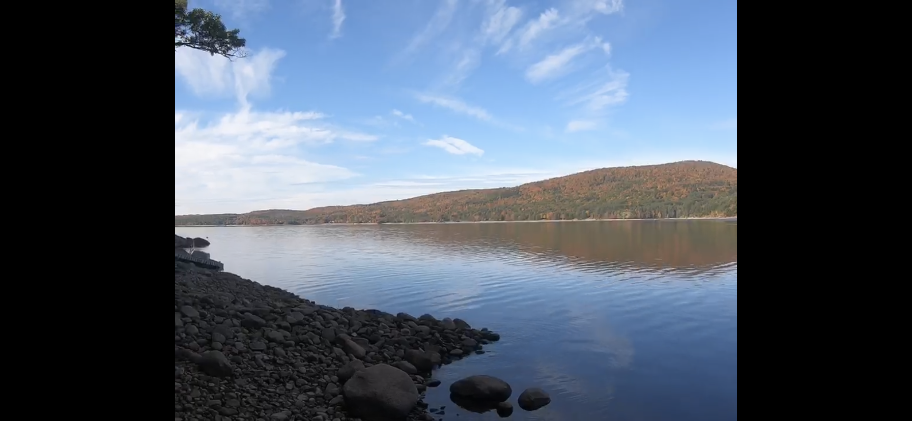 Painting of a calm lake reflecting autumnal hills under a partly cloudy sky, rocky shoreline in the foreground.