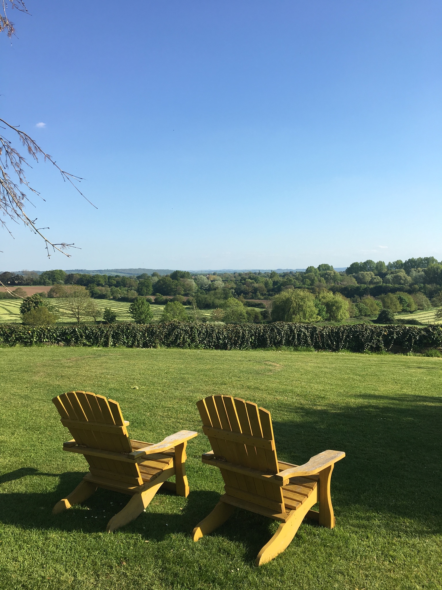 Two Adirondack chairs on a grassy lawn overlooking a verdant landscape.