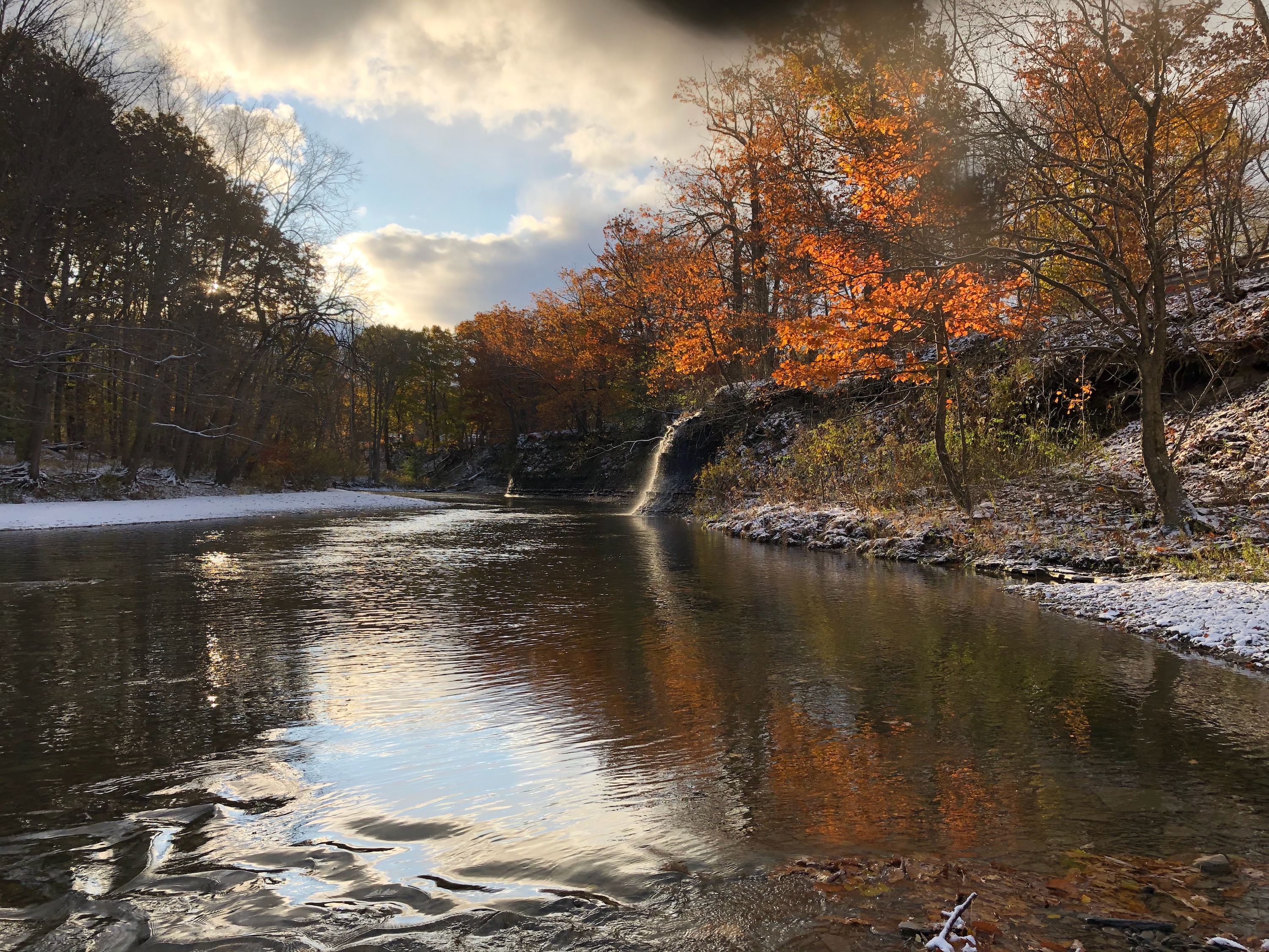 Autumnal landscape painting of a calm river reflecting fall foliage and a small waterfall, with snow dusting the banks.