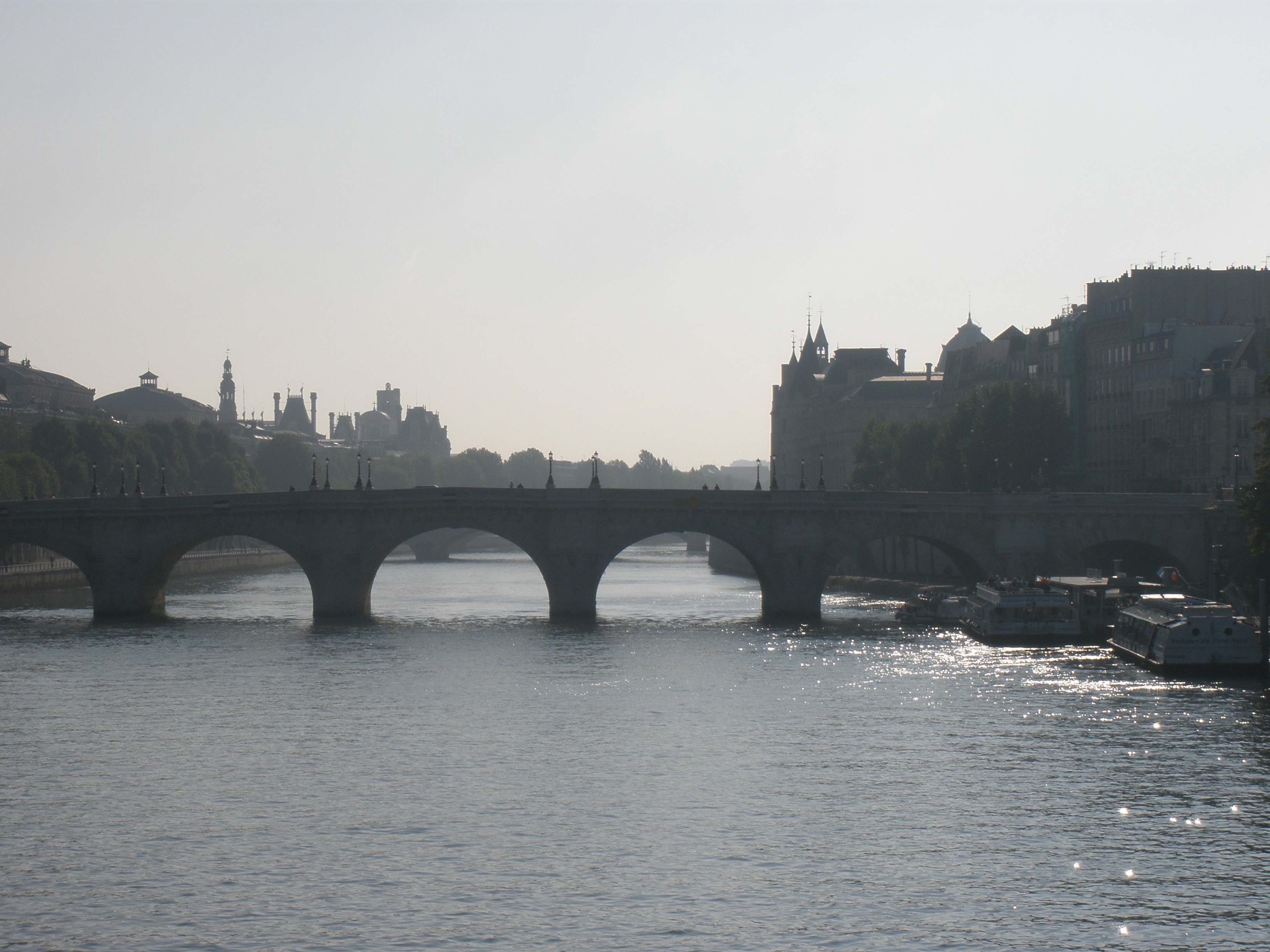 Stone bridge over river with Parisian buildings in background under overcast sky.