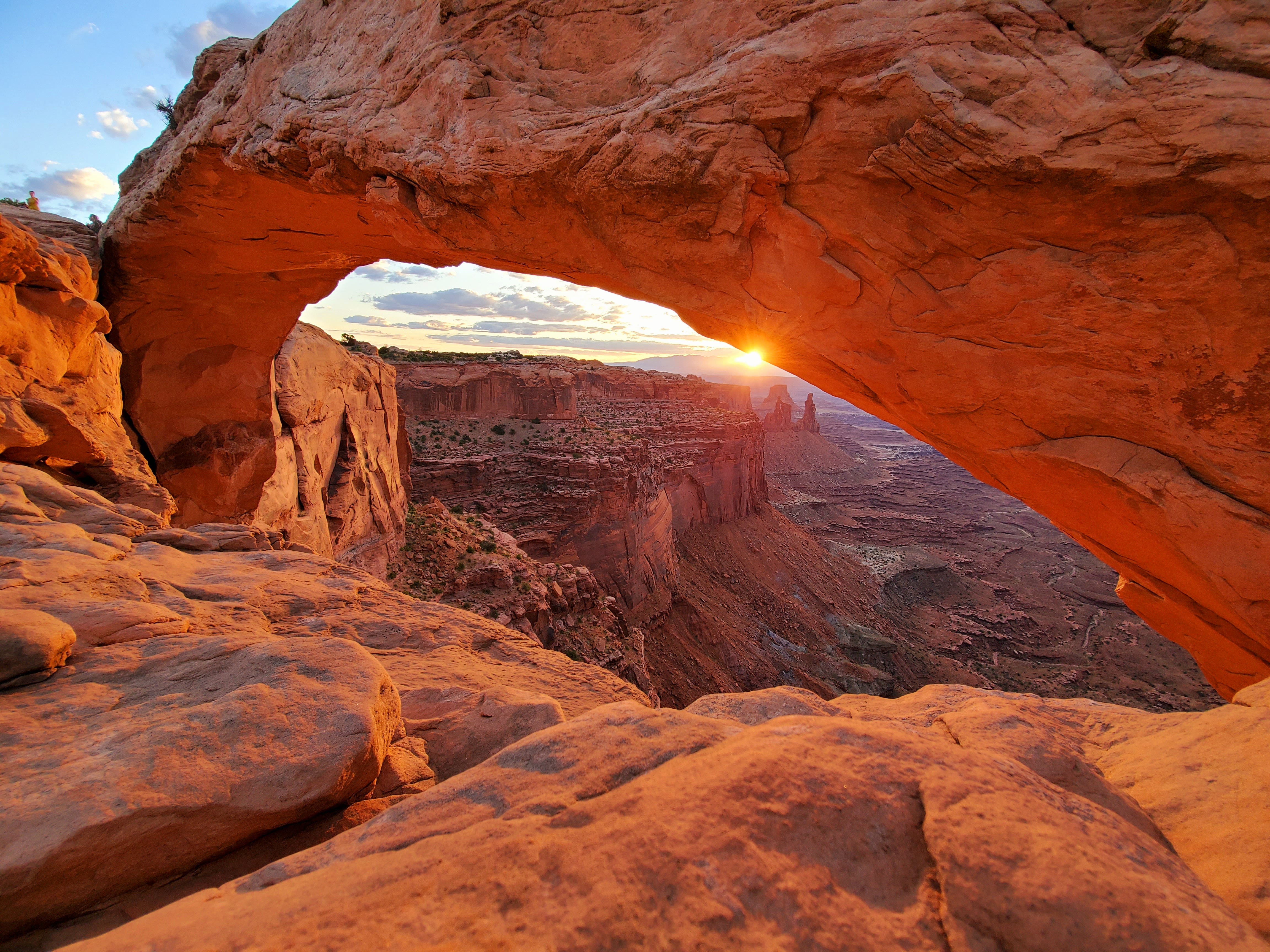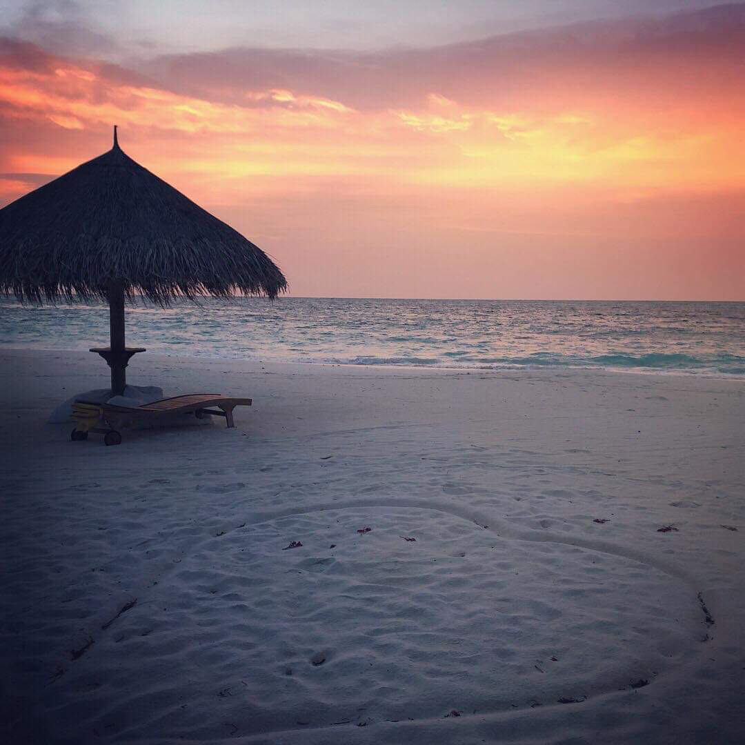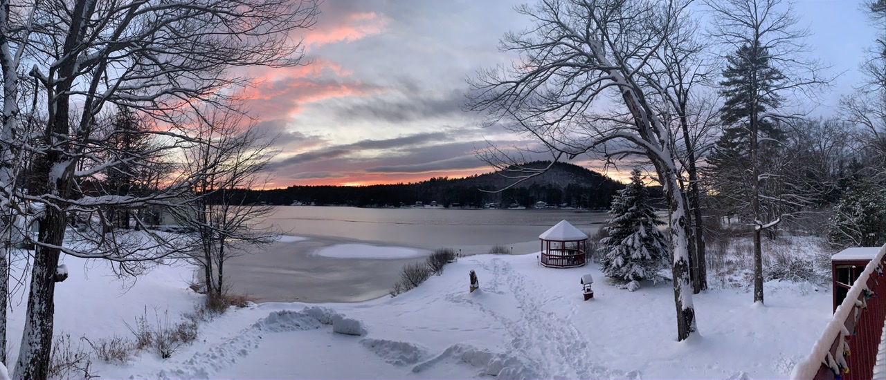 Winter sunset over a snow-covered lake with gazebo and trees.
