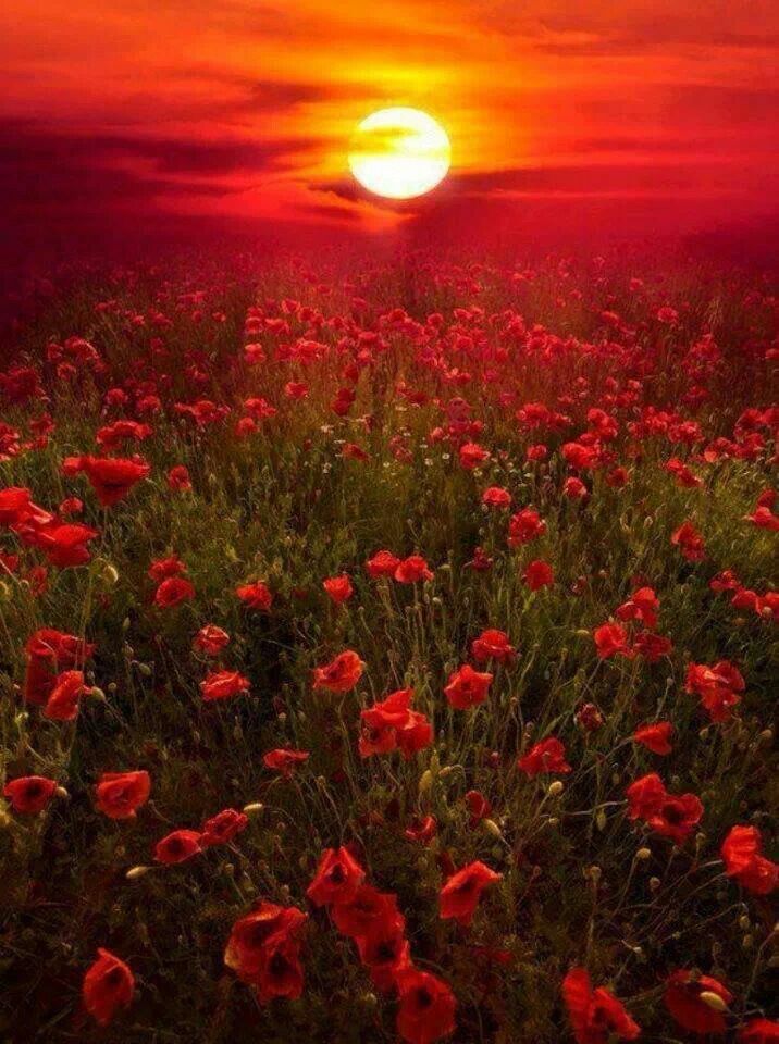 Painting of red poppies and a single blue flower in a field at sunset.