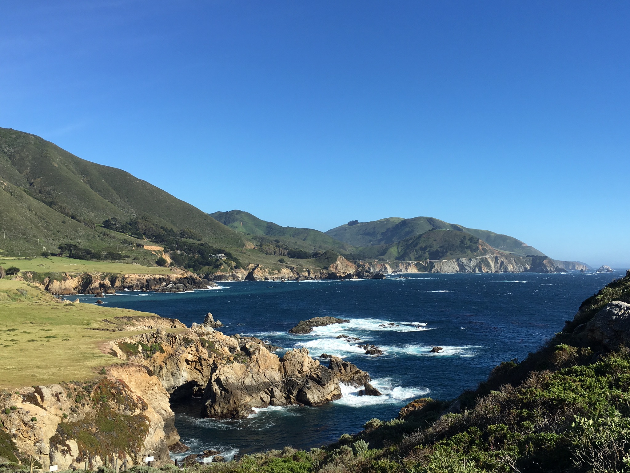 Coastal watercolor painting of green hills, blue ocean, and rocky shoreline.