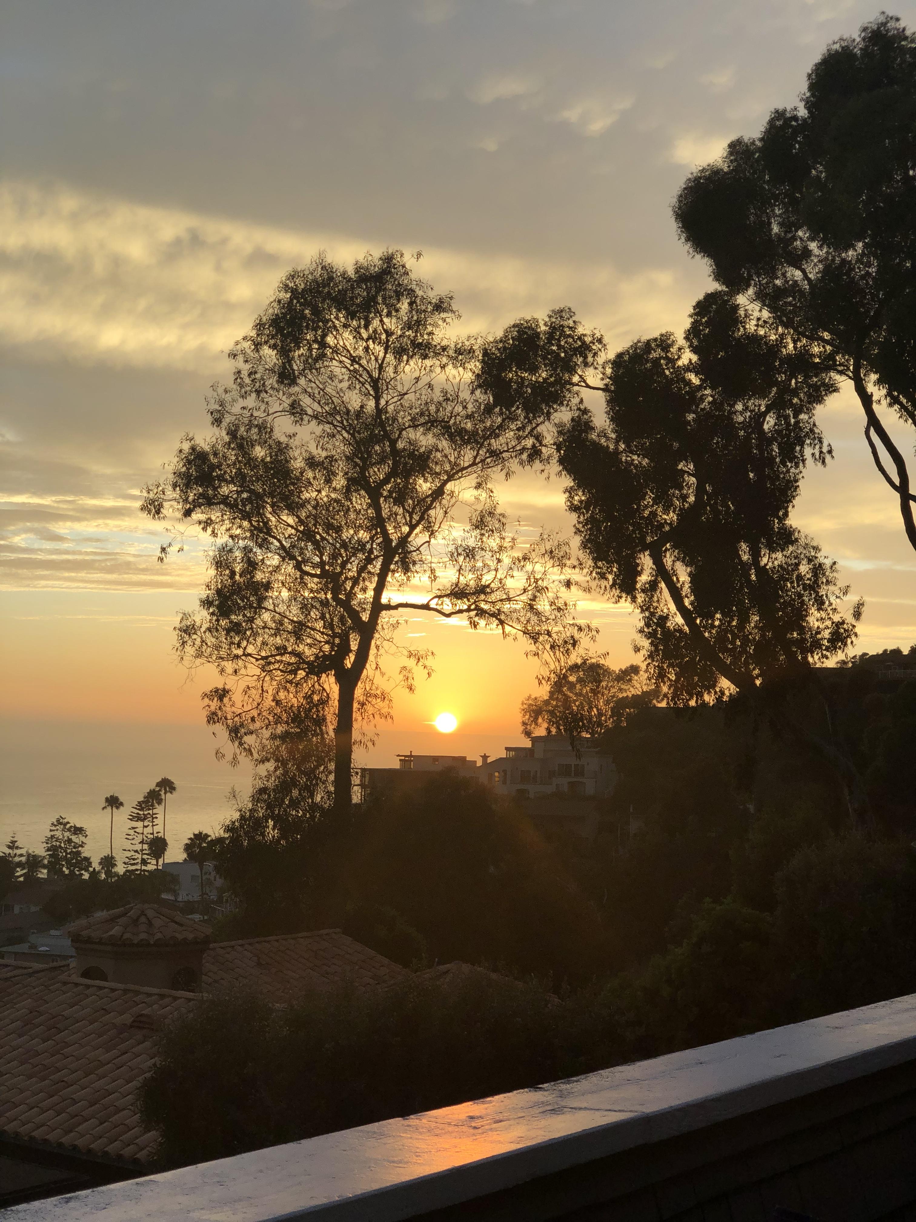Sunset view through trees, over houses and ocean.