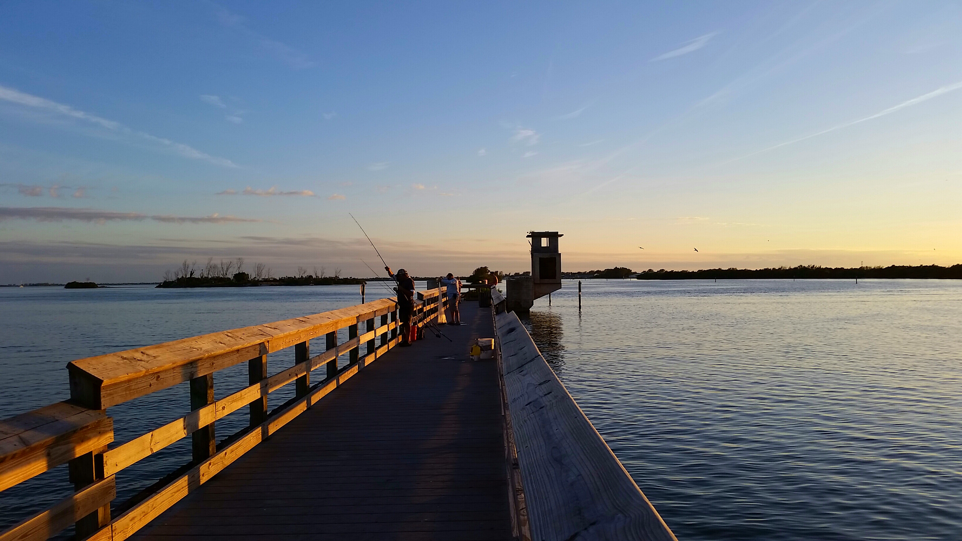 Sunset over calm water, fishermen on a pier.