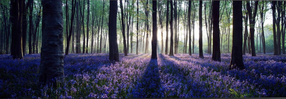 Painting of a forest floor covered in purple flowers, with tree trunks casting shadows.
