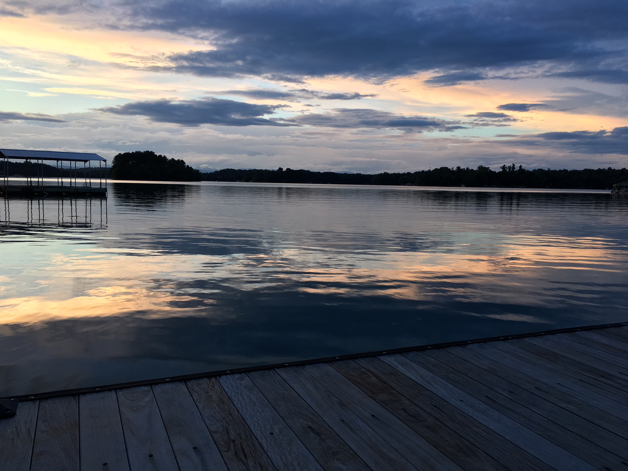 Watercolor painting of a calm lake at sunset viewed from a wooden dock.