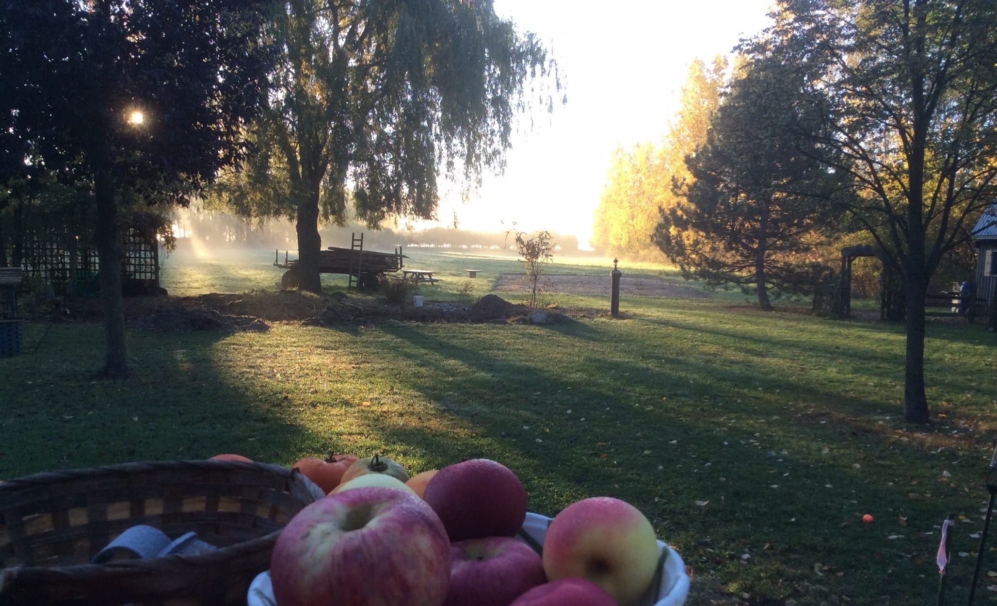 Painting of apples in a bowl in the foreground, with a sunlit yard, trees, and wagon in the background.