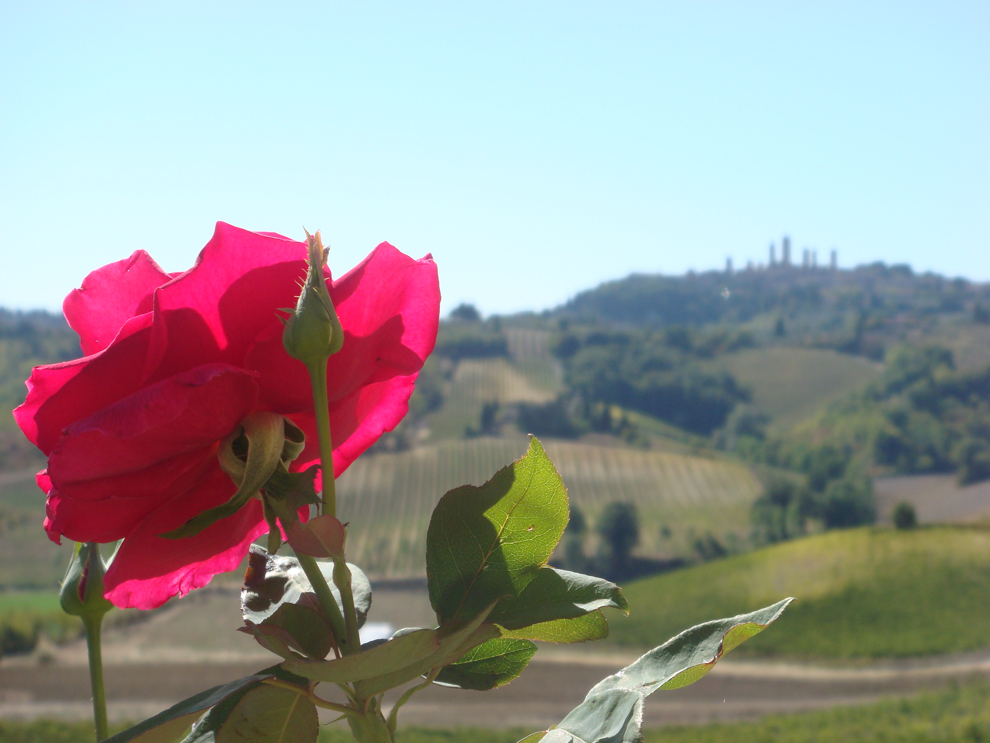 Painting of a large red rose in the foreground with a rolling green hill landscape in the background.