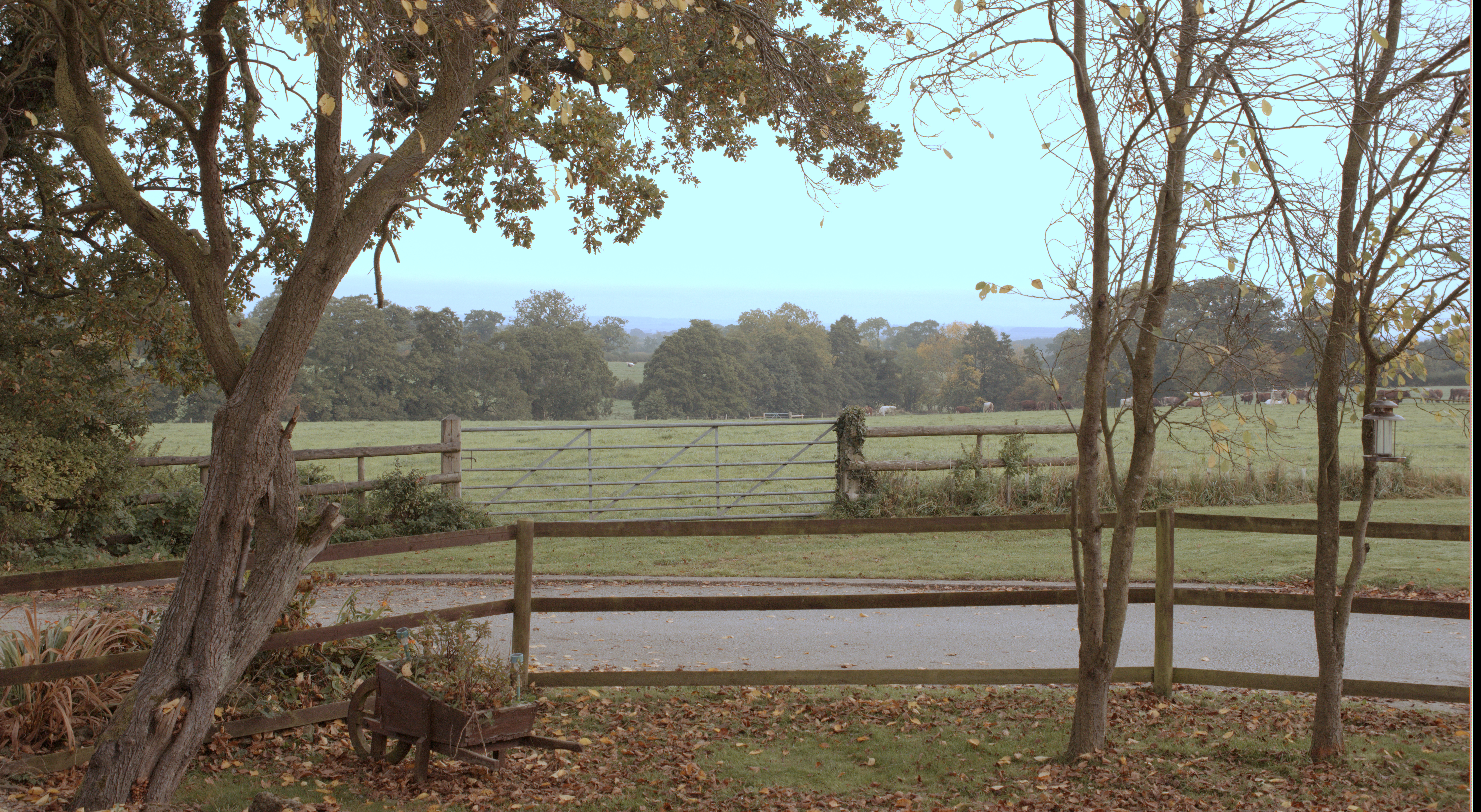 Autumnal landscape painting of a field with sheep, trees, and a wheelbarrow.