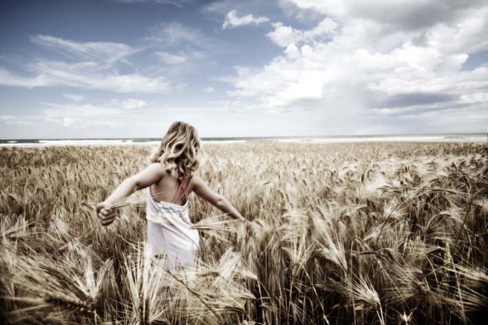 Woman in white dress running through tall grass toward ocean under cloudy sky