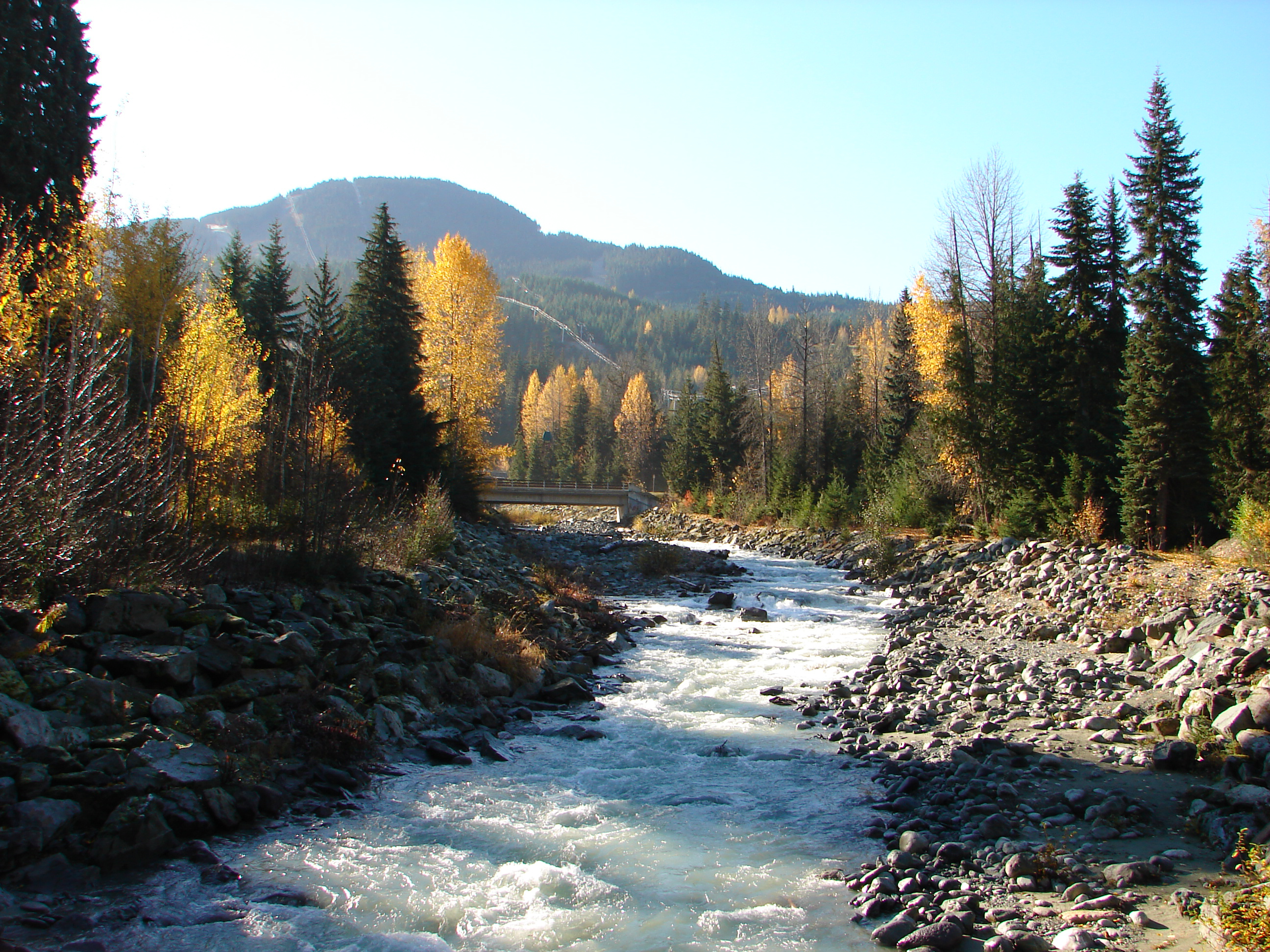 Autumnal landscape painting of a river flowing through a rocky stream bed, with a bridge and trees with yellow leaves.