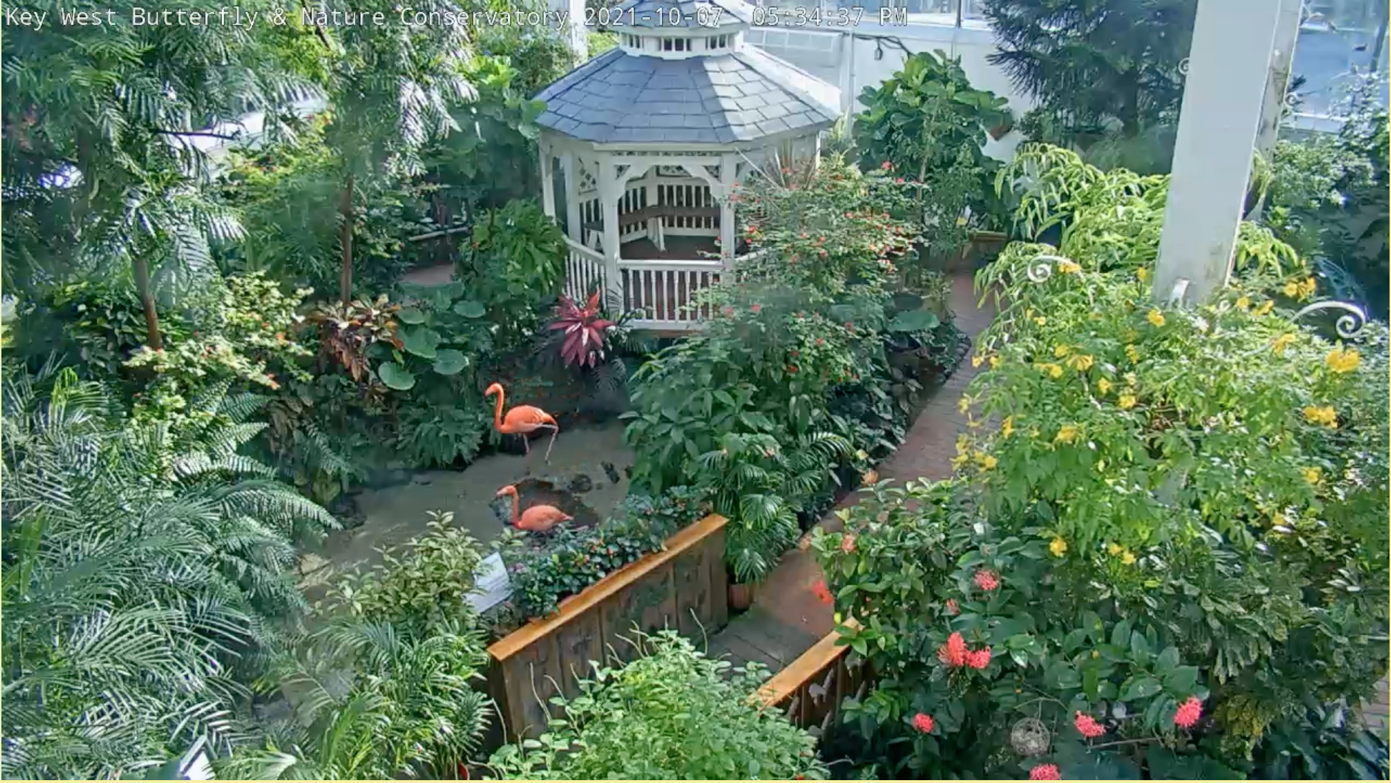 Couple embracing on a bridge in a lush garden with a gazebo and flamingos.