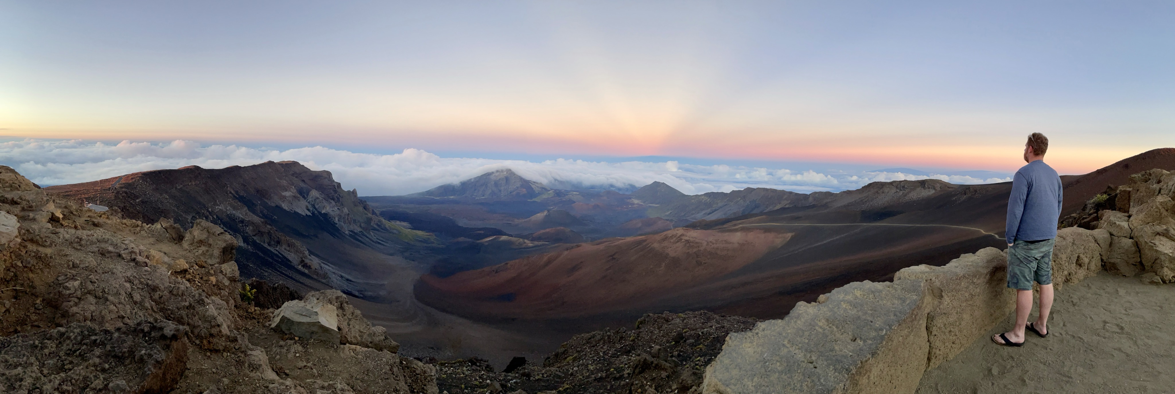 Painting of a man overlooking a vast mountain range at sunrise.