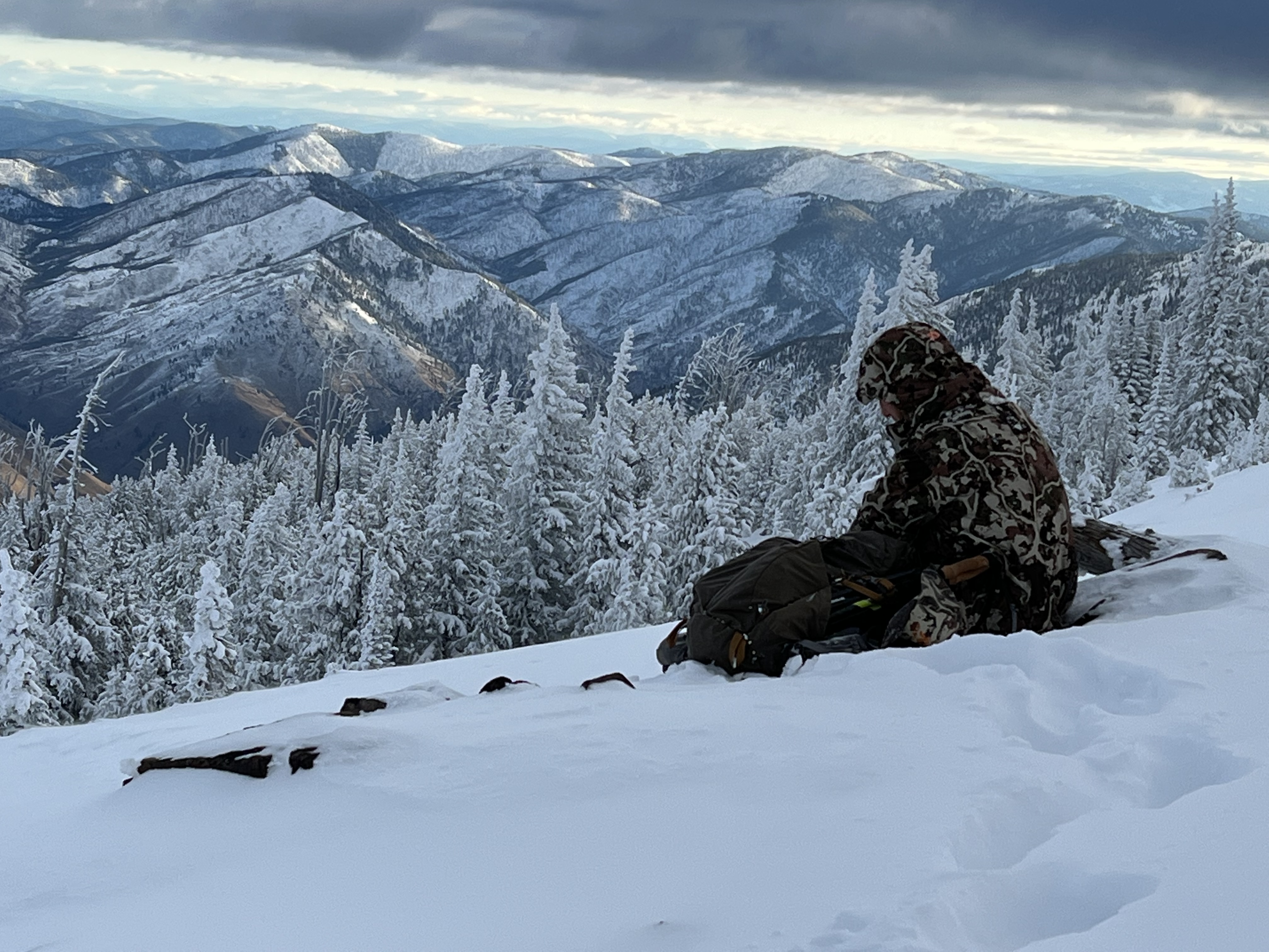Person in camouflage sitting in snow overlooking snow-covered mountains and forest.
