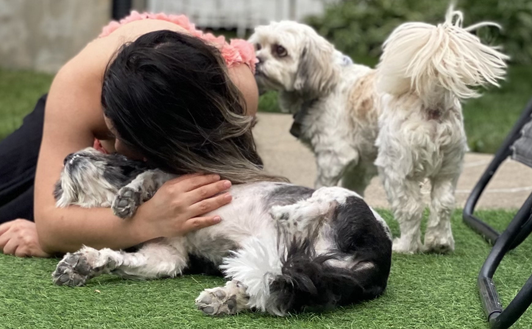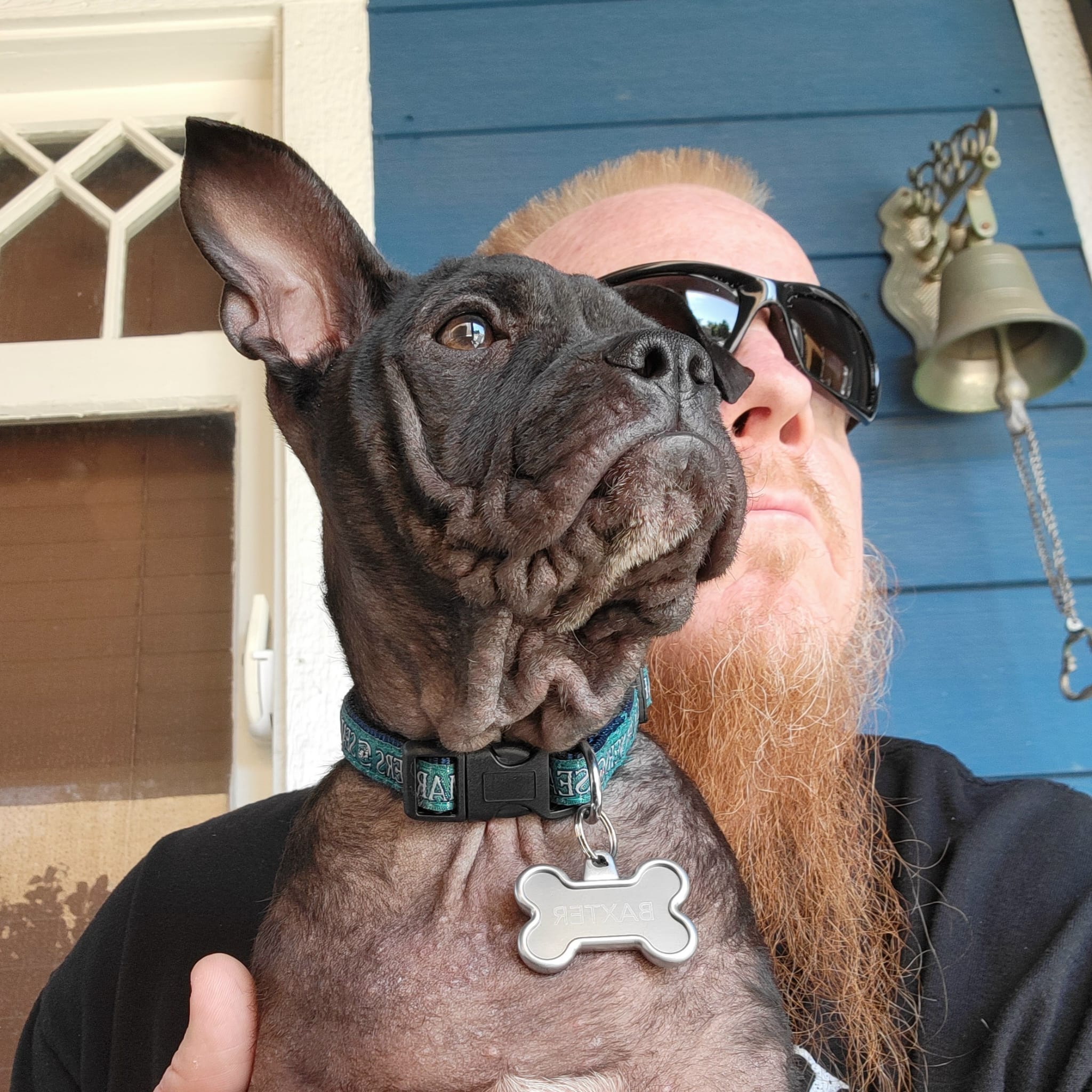 Painting of a man and his dog, the dog is a dark brindle, wearing a teal collar with a bone-shaped tag, and looking up at the man, who has red hair and is wearing sunglasses.