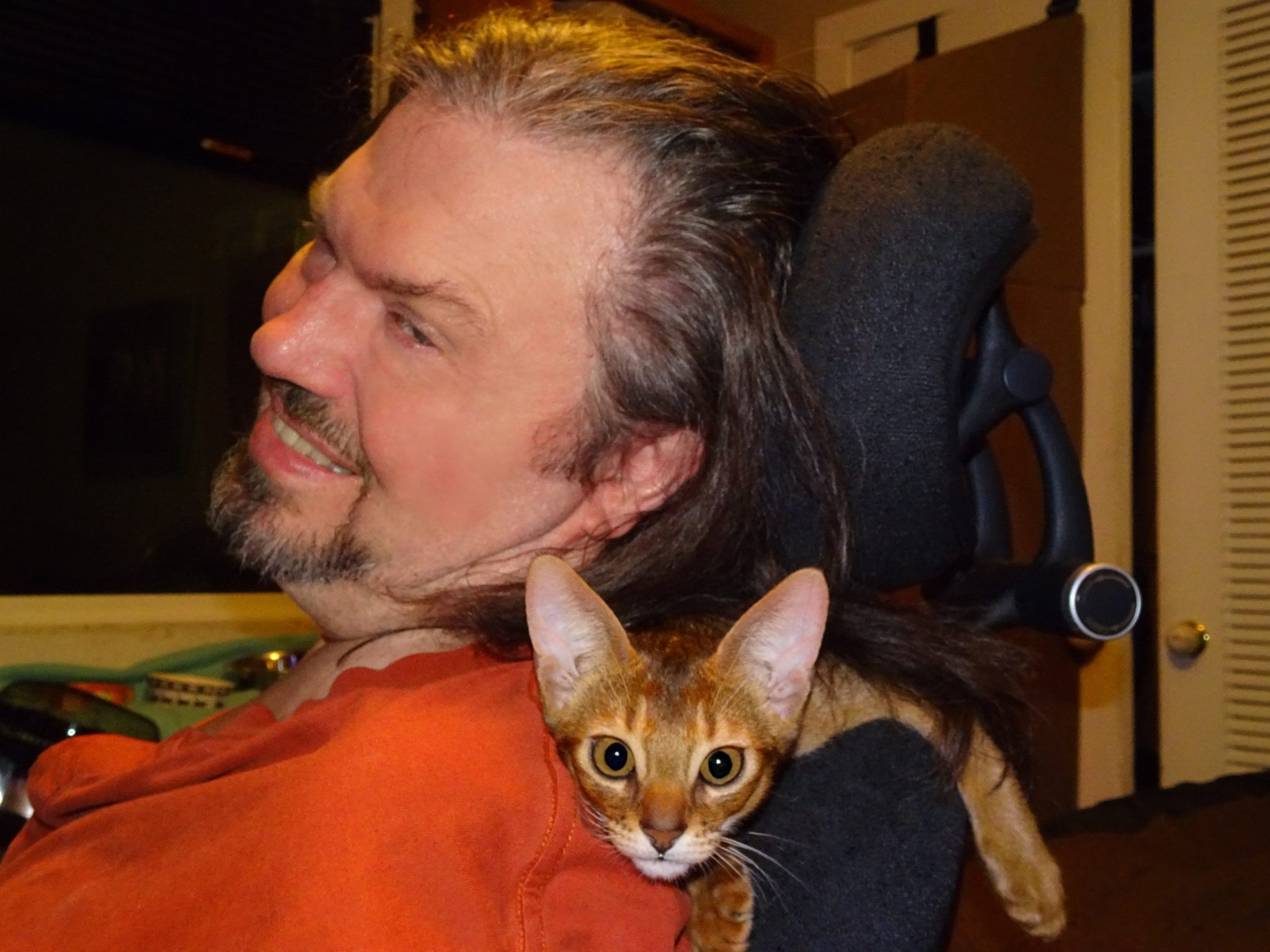 Painting of a man in a wheelchair with a cat on his shoulder