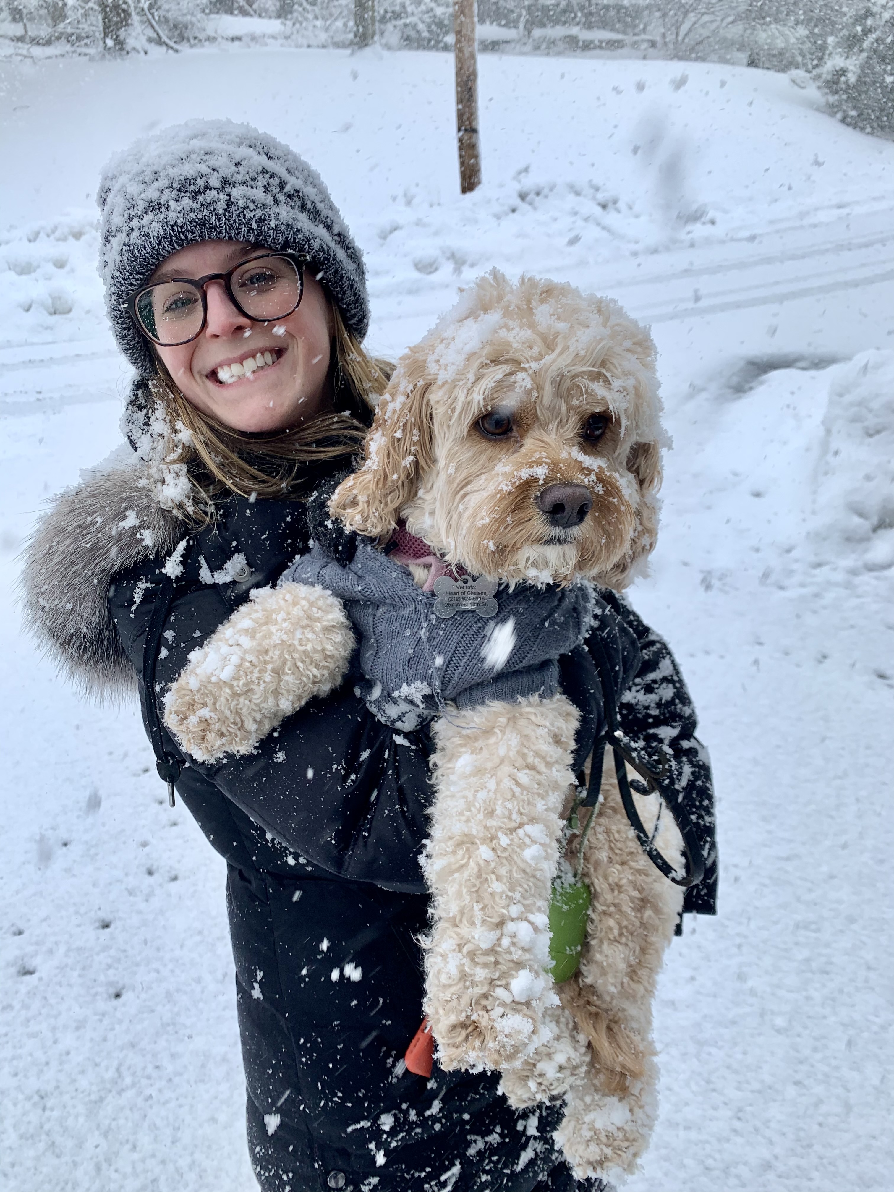 Oil painting of a smiling woman in a winter hat and glasses holding a fluffy dog covered in snow.