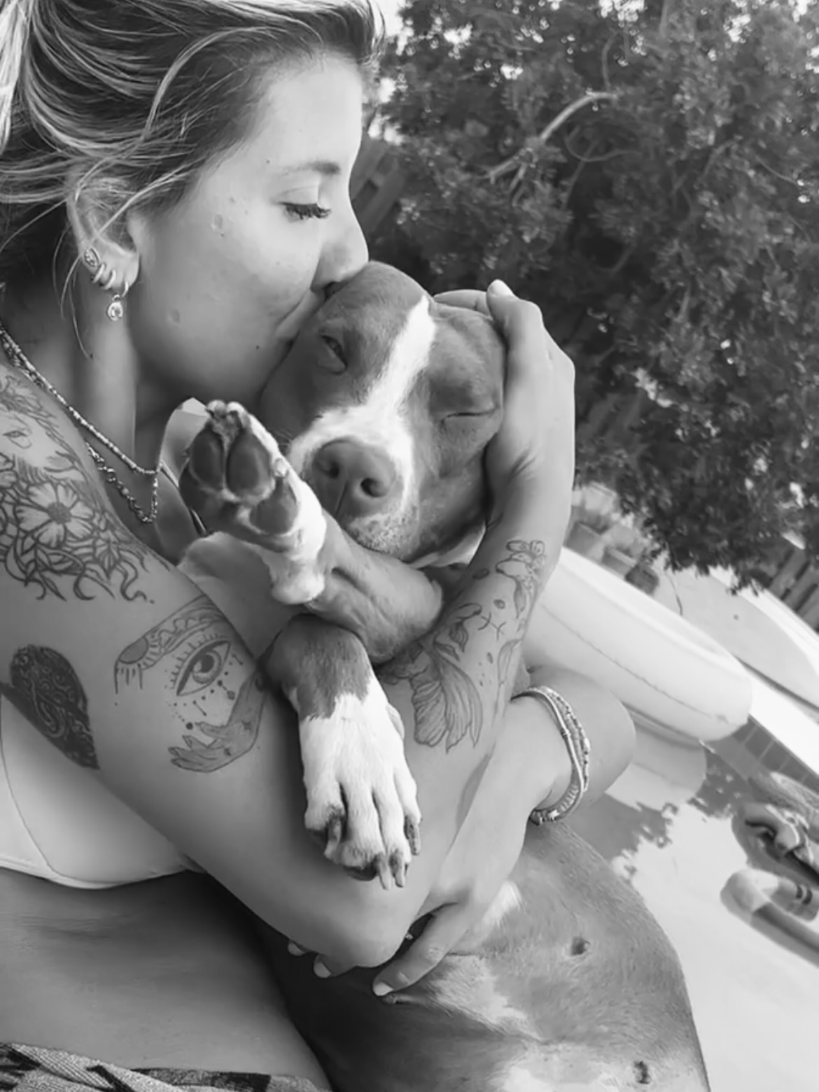 Black and white painting of a tattooed woman kissing her dog.