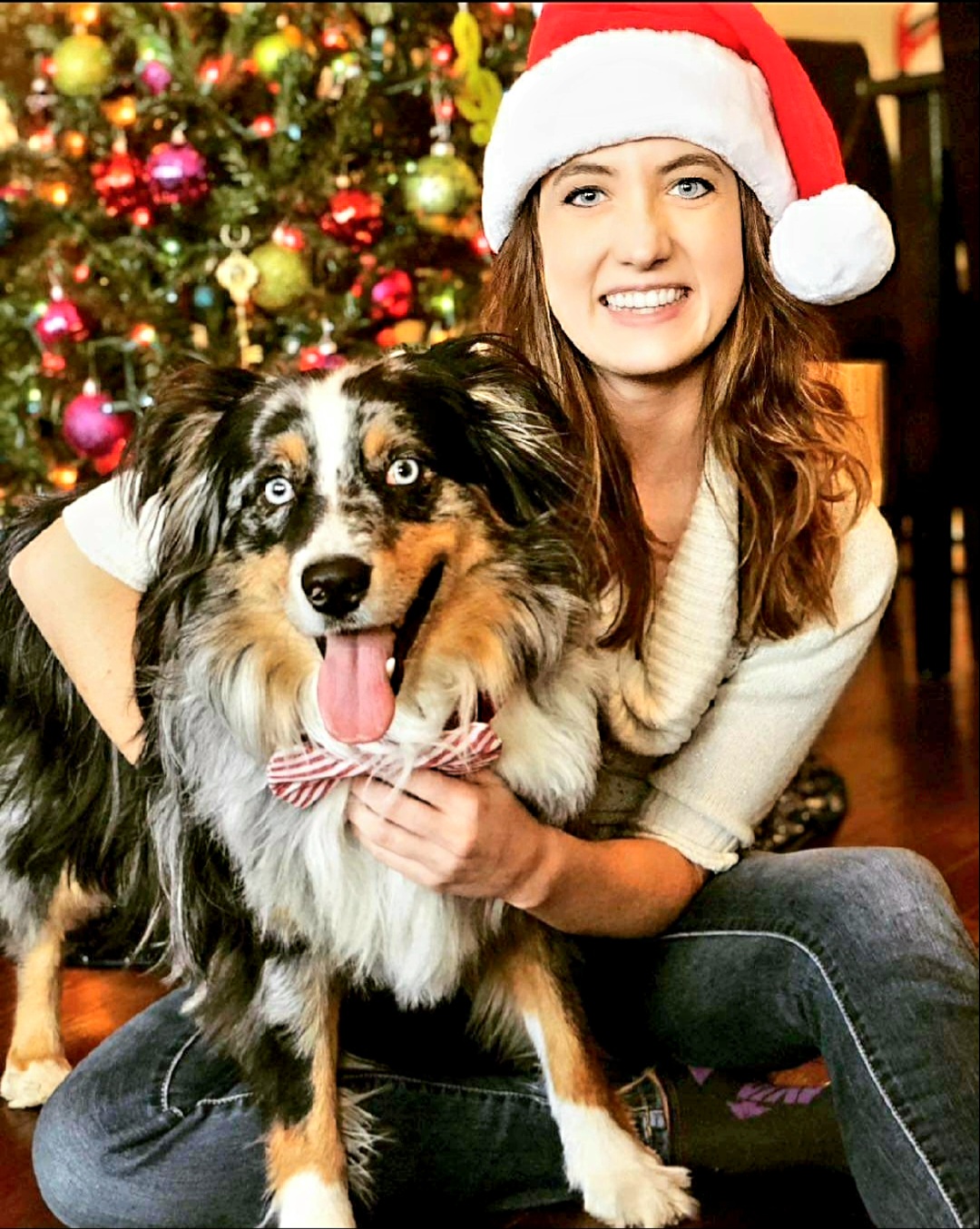 Painting of a woman in a Santa hat holding an Australian Shepherd in front of a Christmas tree.