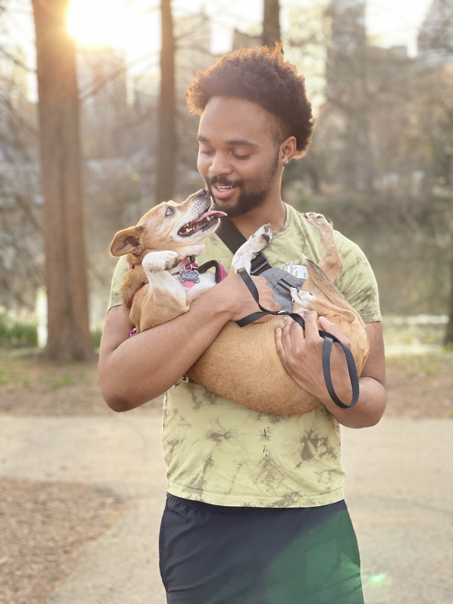 Painting of a man holding a small dog with a halo, outdoors.