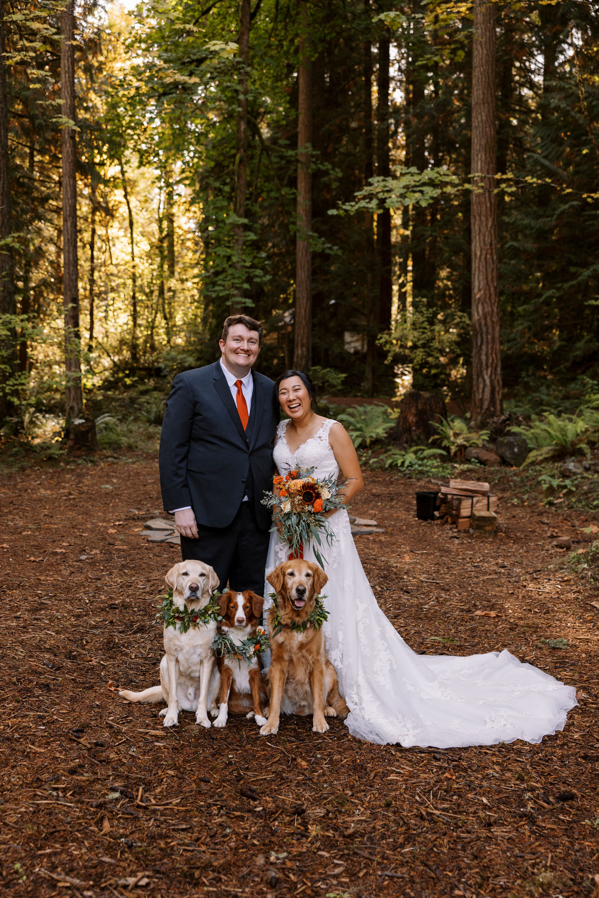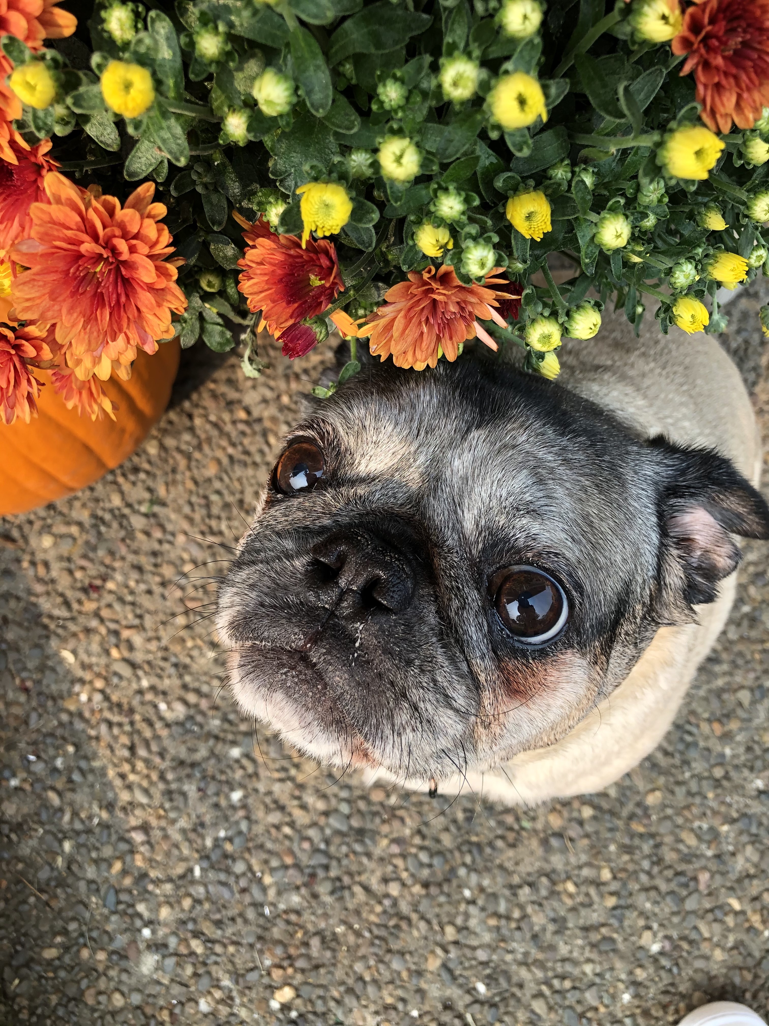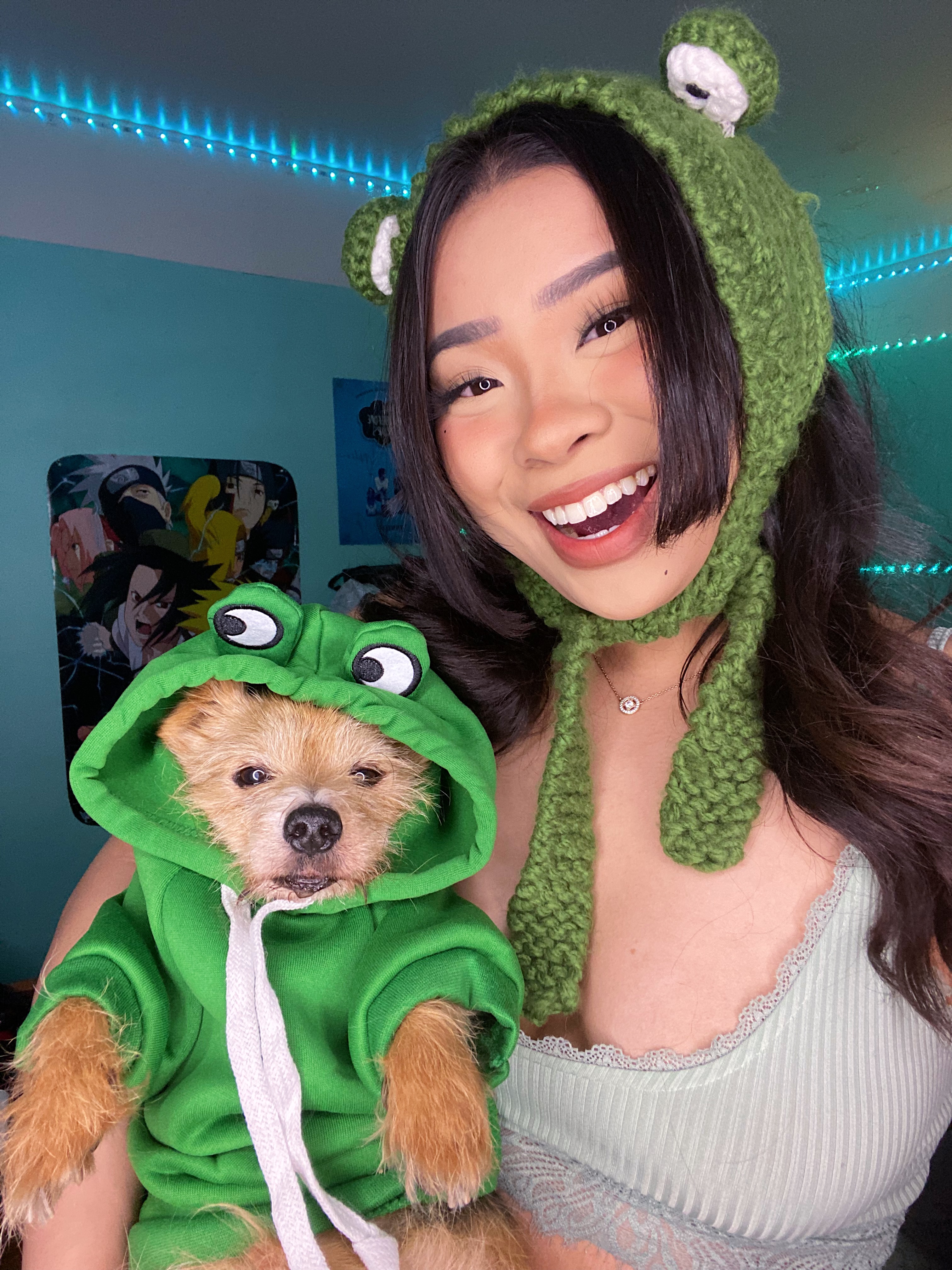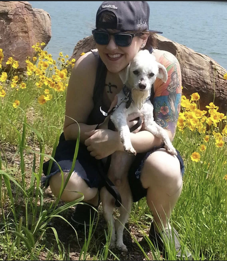 Portrait painting of a smiling woman with tattoos holding a small white dog, yellow flowers and water in background.