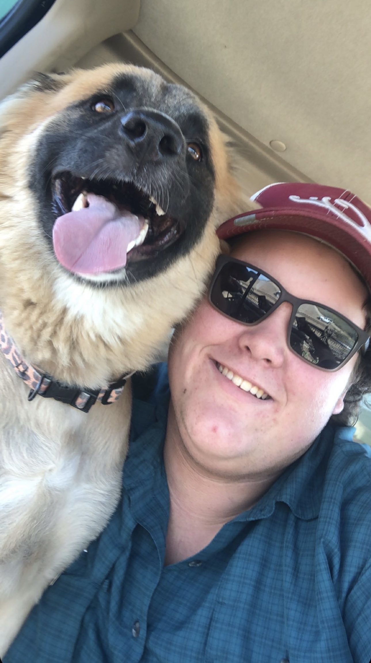 Painting of a person and their dog, the dog is a leonberger with its tongue out, and the person is wearing sunglasses and a hat.