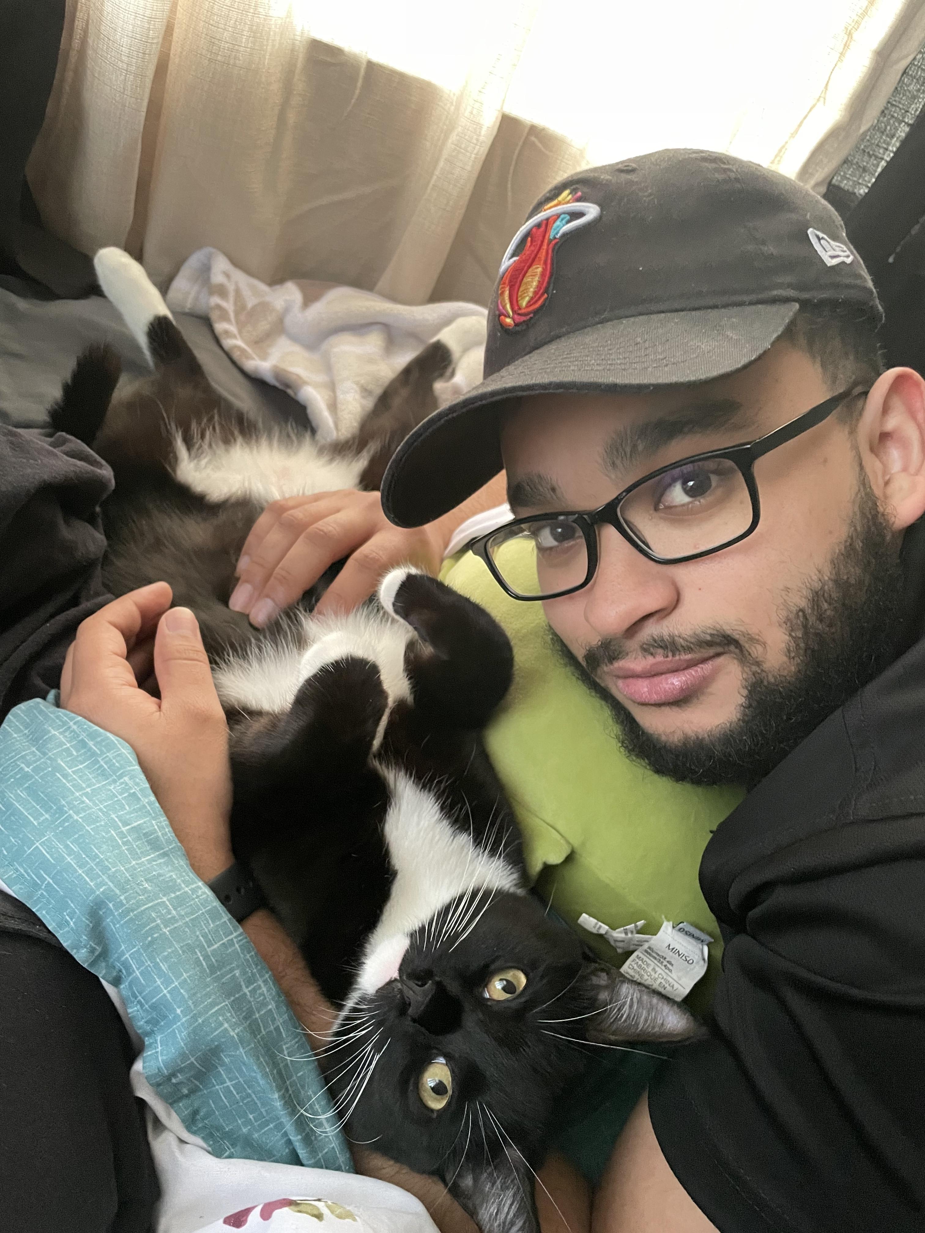 Oil painting of a man cuddling a tuxedo cat.
