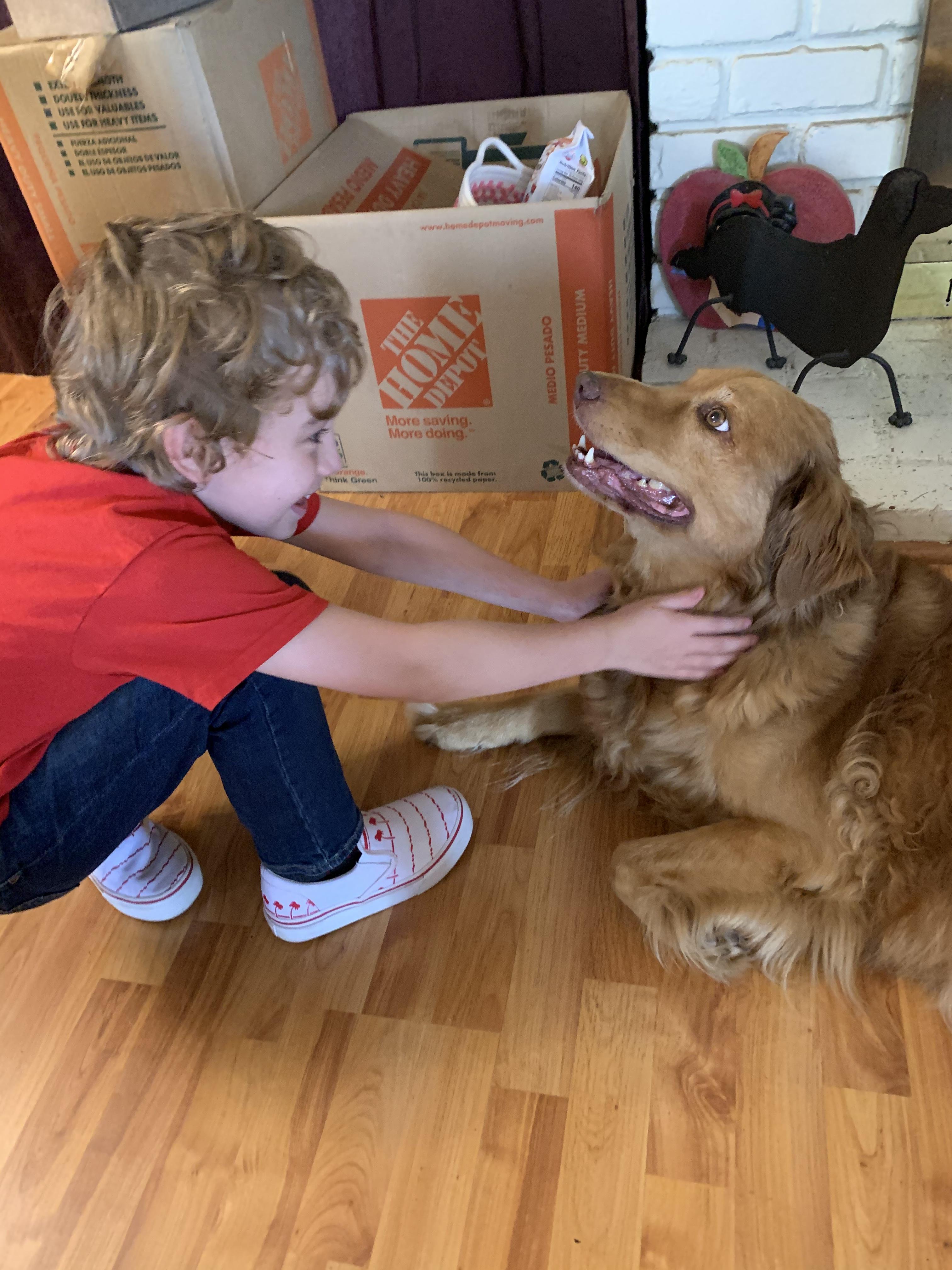 Painting of toddler and French bulldog.