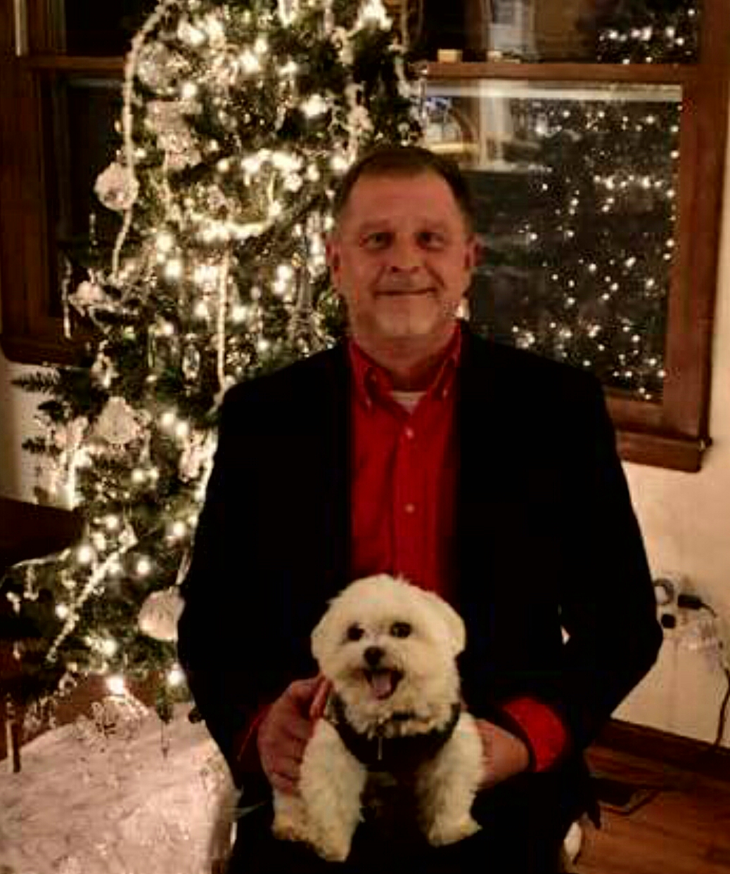 Man emotionally unboxing a framed portrait of himself and his small white dog.