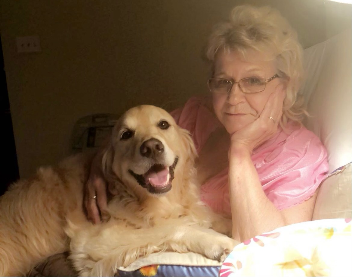 Woman crying while holding a portrait of a woman and her Golden Retriever.