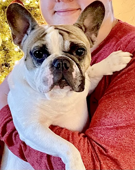 Painting of a smiling older man wearing glasses and a blue baseball cap, holding a French Bulldog.