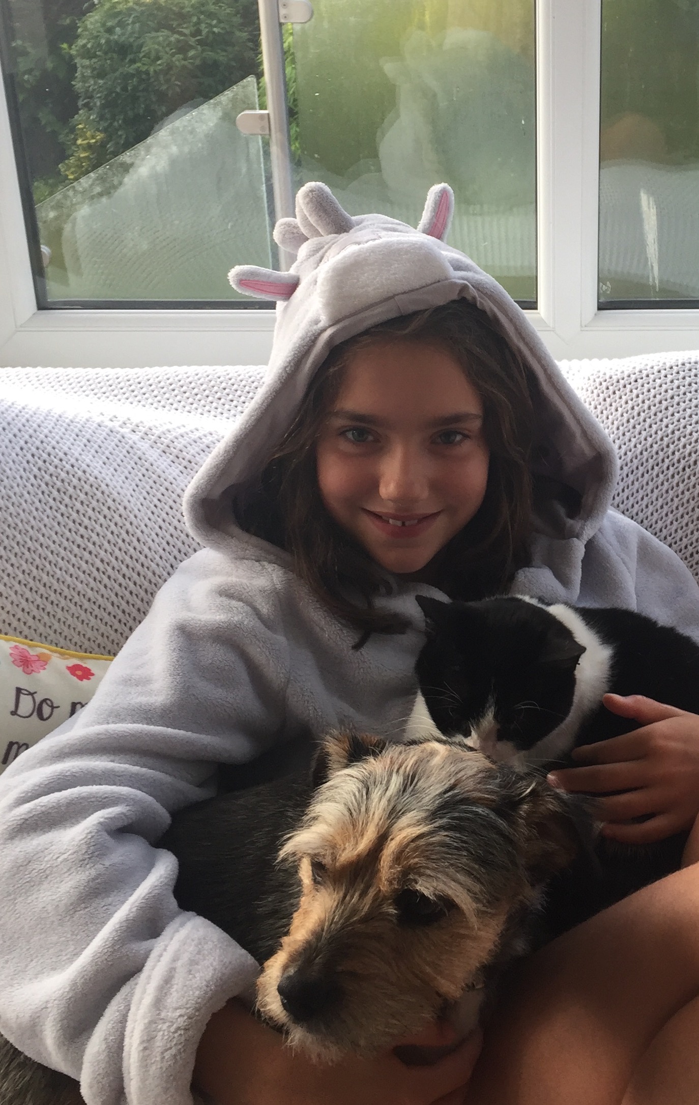 Painting of a girl in a unicorn hoodie hugging a cat and a dog.