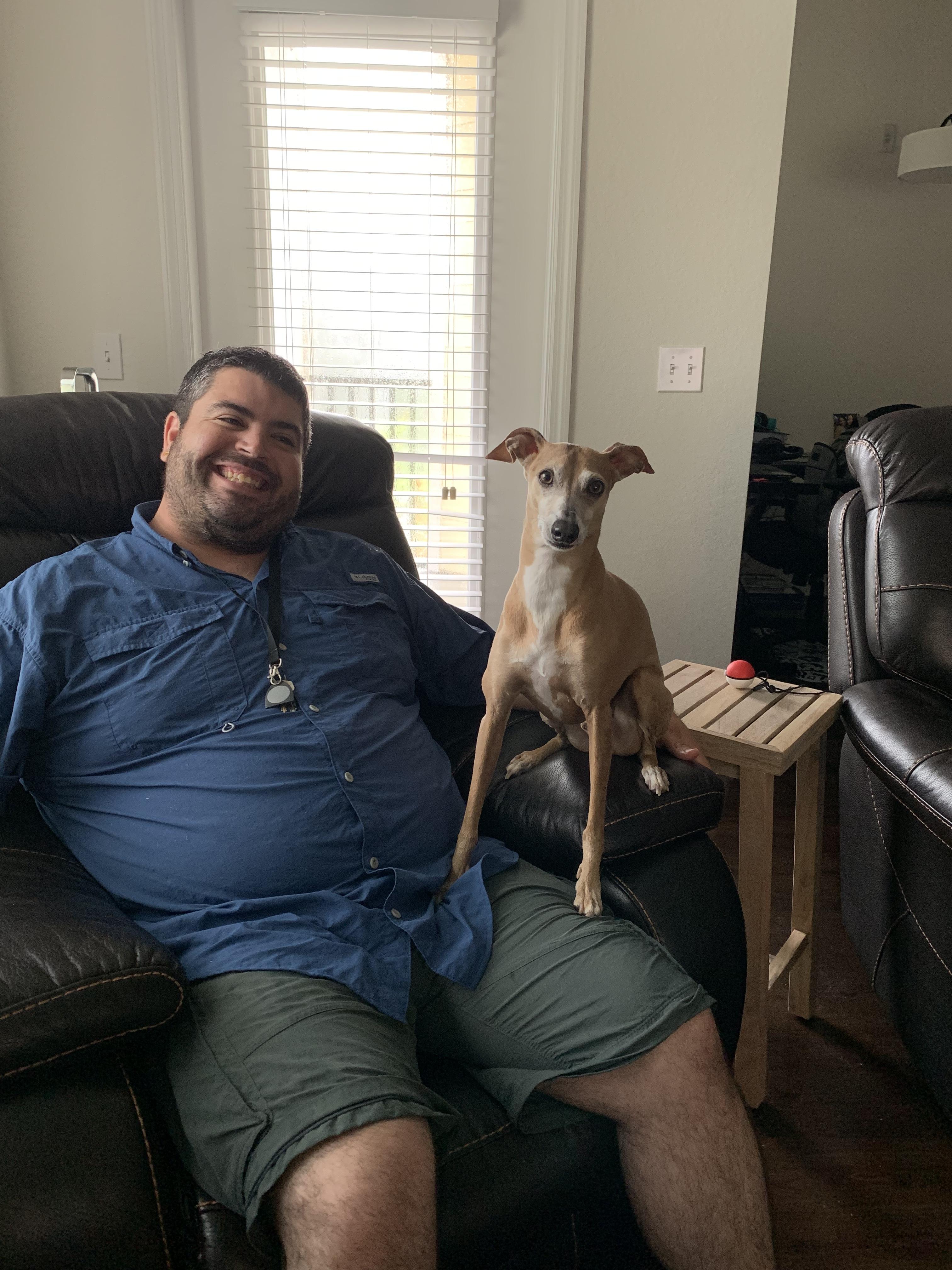 "Hi! This is my husband Alexander Alonso. I ordered him this painting of him and Mr. Swifty shortly after Mr. Swifty passed (Jan. 23, 2022). Swifty was an Italian Greyhound that survived cancer in his younger years and also helped Alex through very tough times in 2008. Alex always said that Swifty came into his life to keep him going through all the hard times. Swifty was such a loving cuddling buddy, so playful and careful with our daughter (1yr old). He left us unexpectedly, crossed the rainbow bridge in his sleep. This painting was created using two different images because he didn’t have one like this. Thanks to these amazing artists, Alex can now have this beautiful painting of him and his best buddy. We definitely miss Mr. Swifty every day ?? "