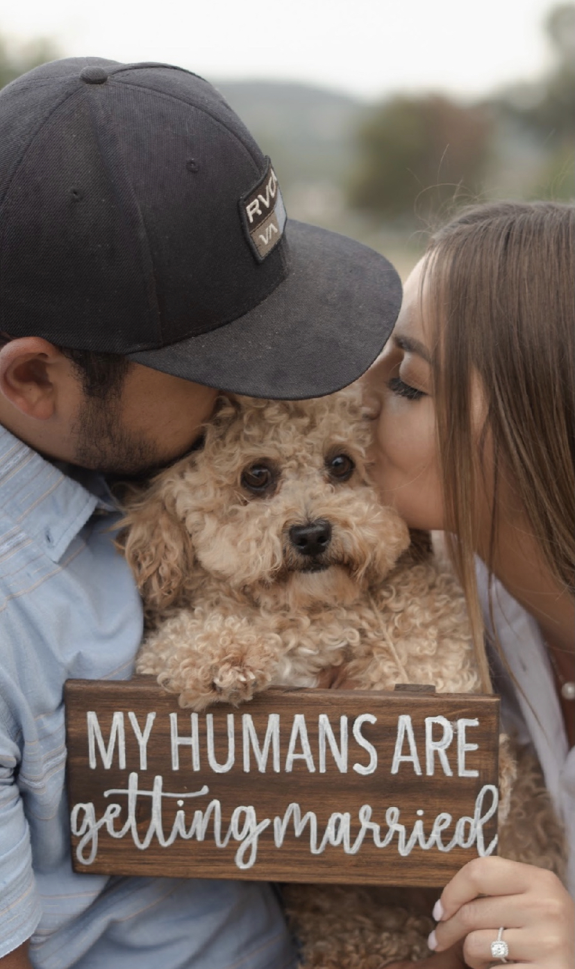 Painting of a couple kissing a dog holding a sign that says My humans are getting married!