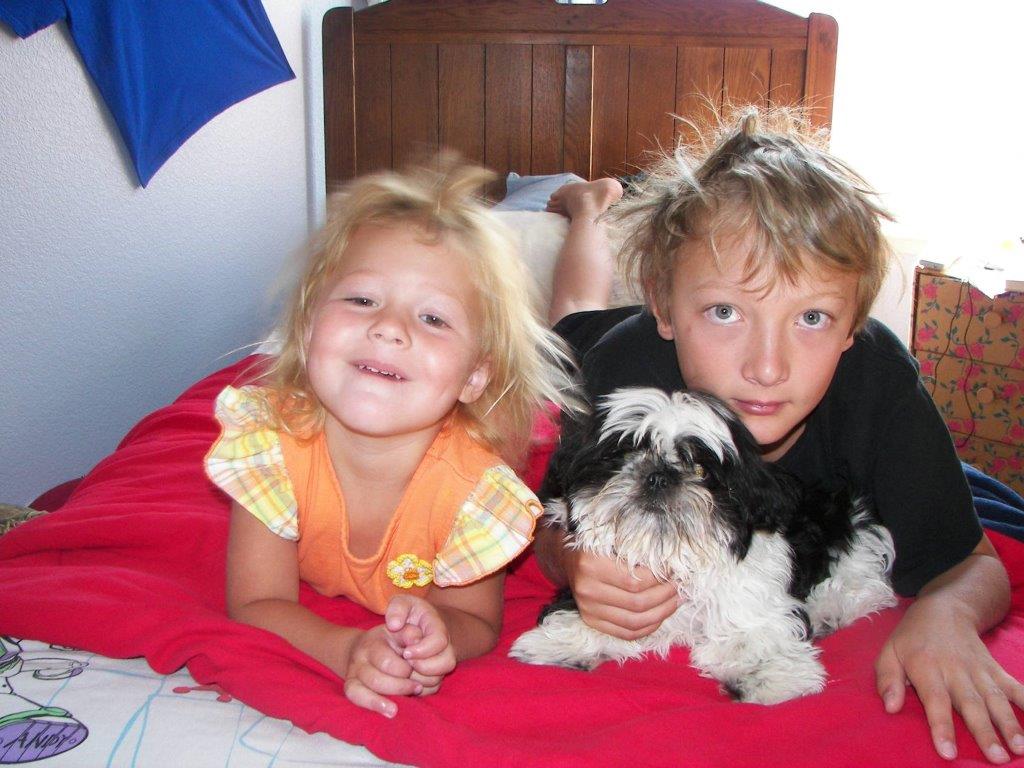 Colored pencil drawing of a girl and boy lying on a bed with their dog.
