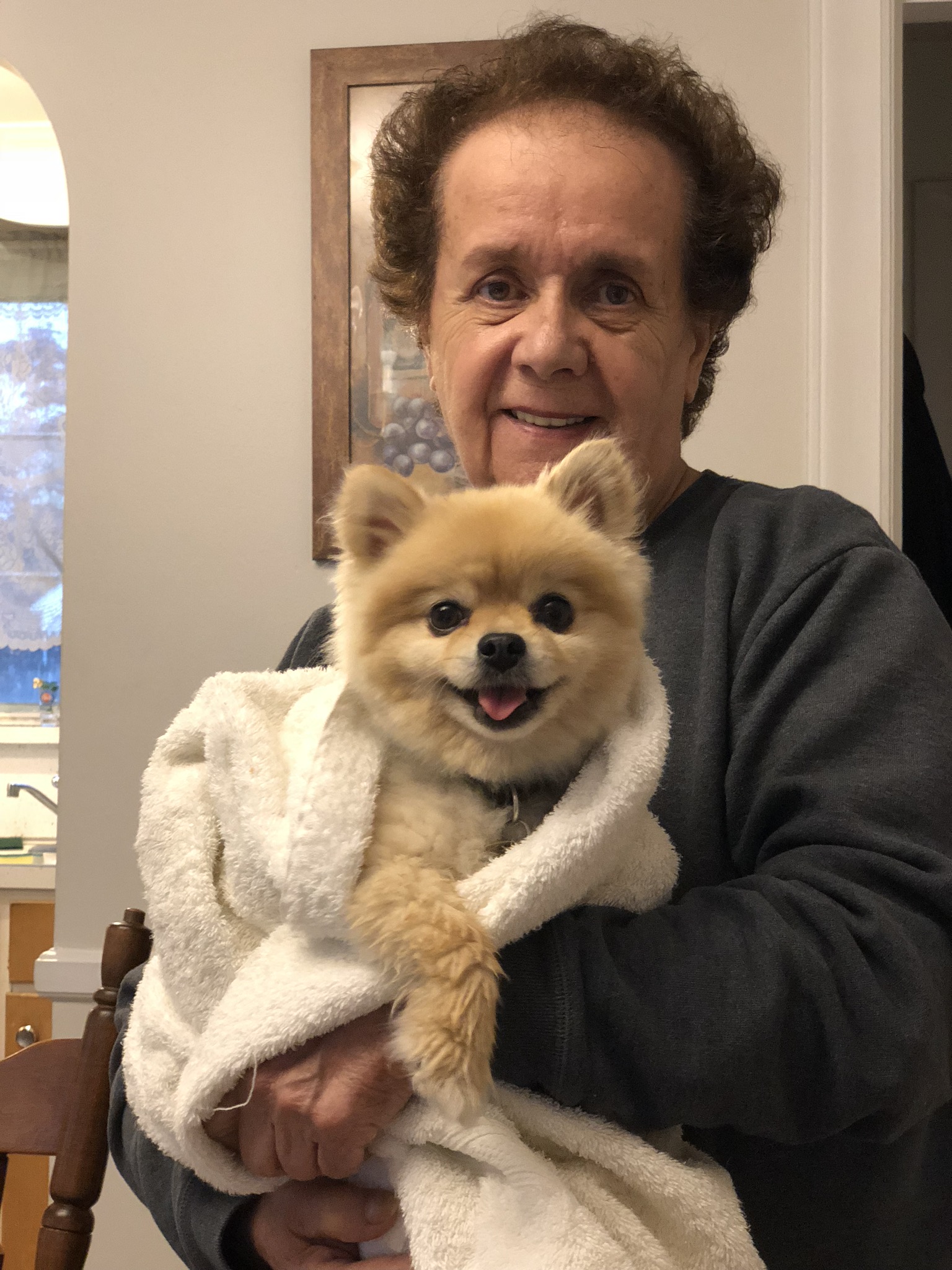 Painting of an elderly woman holding a Pomeranian wrapped in a blanket.