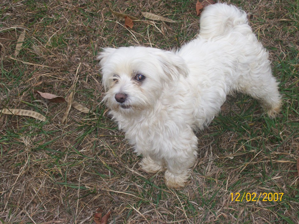 Painting of a man and his fluffy Shih Tzu dog.